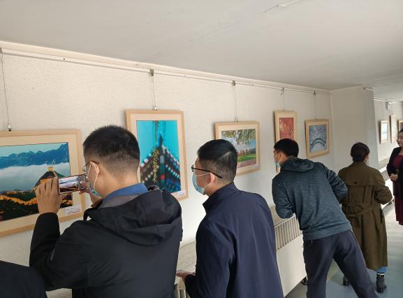 在展馆内,全体教职工认真观赏书画、摄影作品,在志愿者的解说下认真体会书画、摄影作品所蕴含的意义,大家不时停下脚步交流探讨,感受北体人对奋进新征程的自信,深刻领悟到北体人对“使命在肩,奋斗有我”精神的坚守。