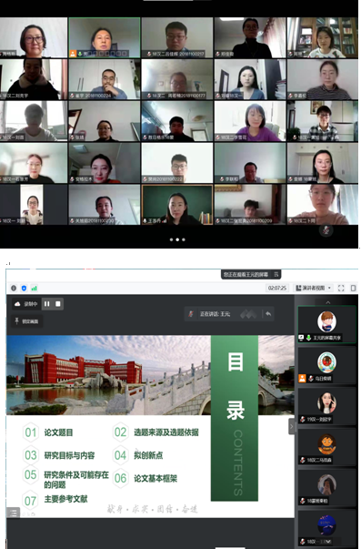 为了保证线上开题答辩的顺利进行,每个答辩小组在答辩开始之前都单独进行了设备调试和演示。在答辩过程中,学生们采用屏幕分享PPT的方式,从毕业论文选题背景、研究意义、研究内容、研究思路、研究方法、论文框架以及进度安排等方面进行了认真陈述。答辩小组老师根据每一位学生的开题汇报,重点指出选题、研究内容和方法中存在的主要问题并提出了修改意见或建议,同时对毕业论文的格式、结构提出了规范化要求。