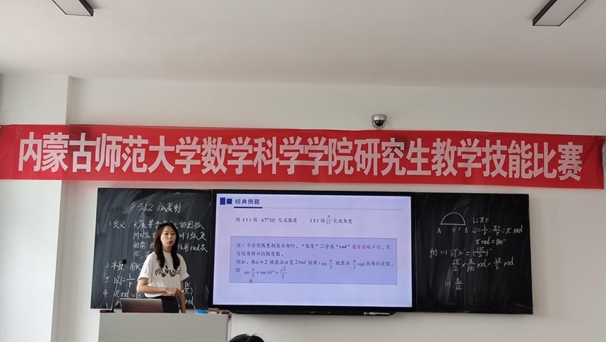 参加比赛的选手有28人,其中24人为专业型硕士研究生、4人为学术型硕士研究生。共分为2组进行,每组有3位评委、14位同学,每名同学模拟授课时间为15分钟。本次比赛所选的3个课题出自2019年人教A版普通高中教科书《数学》必修第一册的内容,有“2.2基本不等式”“4.2.2指数函数的图象与性质”和“5.1.2弧度制”。参赛同学都做了充分的比赛准备,PPT制作精美,合理利用几何画板和GeoGebra等信息技术,动态演示图象和图形变化,加深对知识的理解。在模拟授课过程中,语言流畅、教态自然,注重启发引导,渗透数学思想方法,板书整洁。