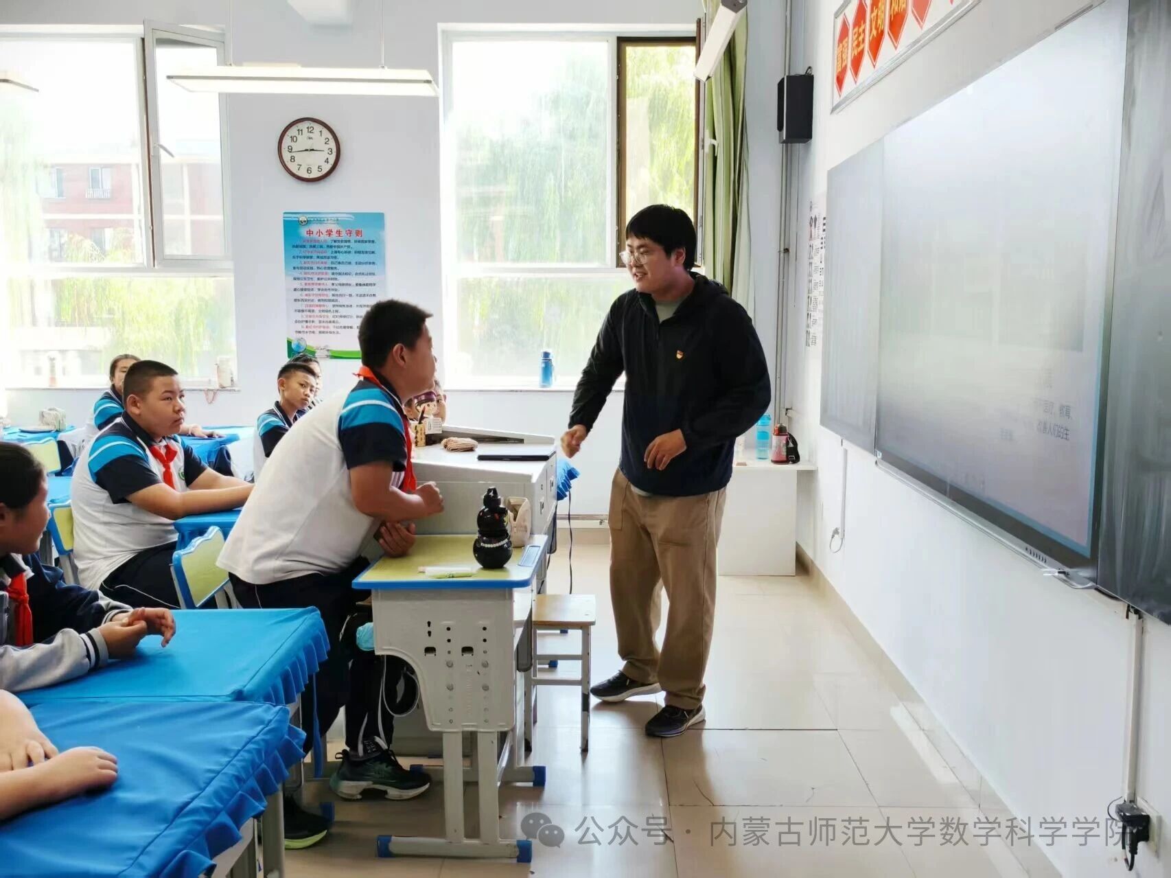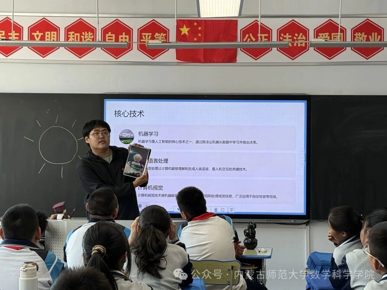 在和林格尔县乳业开发区第一小学,内蒙古科学技术普及学会兼职副秘书长、金年会诚信信誉至上金年会jinnianhuicom博士研究生乌日乐等一群研究生科普志愿者,他们用所学的“数据科学与智能信息处理”“基础数学”“应用数学”等学科专业,用通俗易懂的语言,为小学生普及“人工智能是什么”“人工智能会做什么”“机器是怎样看懂图像的”,通过活动让学生积极体验,在活动中感知科技、思考未来、收获新知。