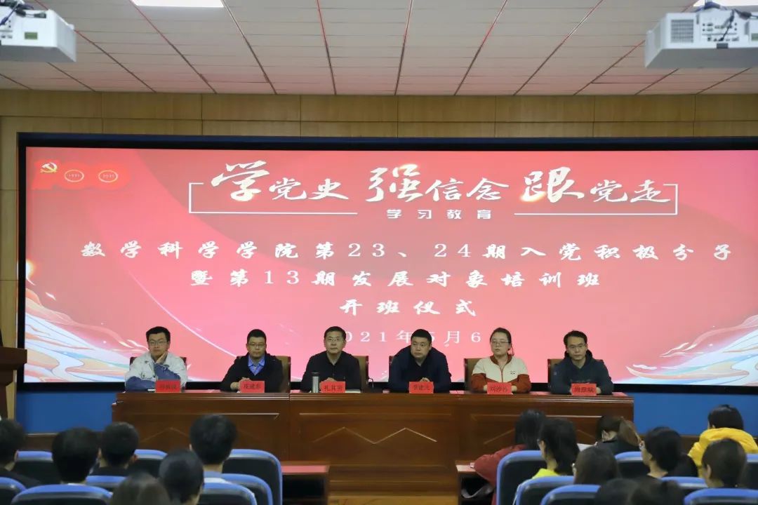 为促进金年会官网发展对象、入党积极分子对党的进一步学习,提高其自身思想水平和政治素养。2021年5月6日,金年会jinnianhuicom于学生事务中心举行第23、24期入党积极分子暨第13期发展对象培训班开班仪式。本次会议由学院团总支书记皮建东老师主持,学院党委书记扎其劳老师,学院党委副书记、副院长季建光老师,学院学生思想政治工作辅导员刘勇波、刘沙沙老师,信息与计算科学学生党支部书记周彦斌老师及全体发展对象、入党积极分子参加此次会议。