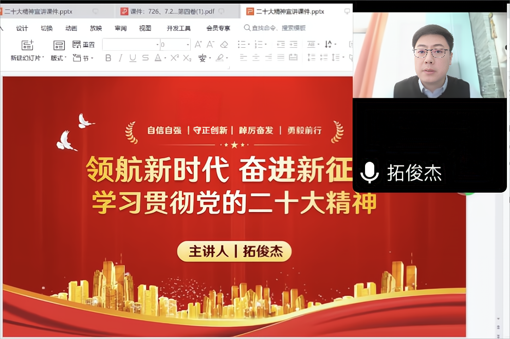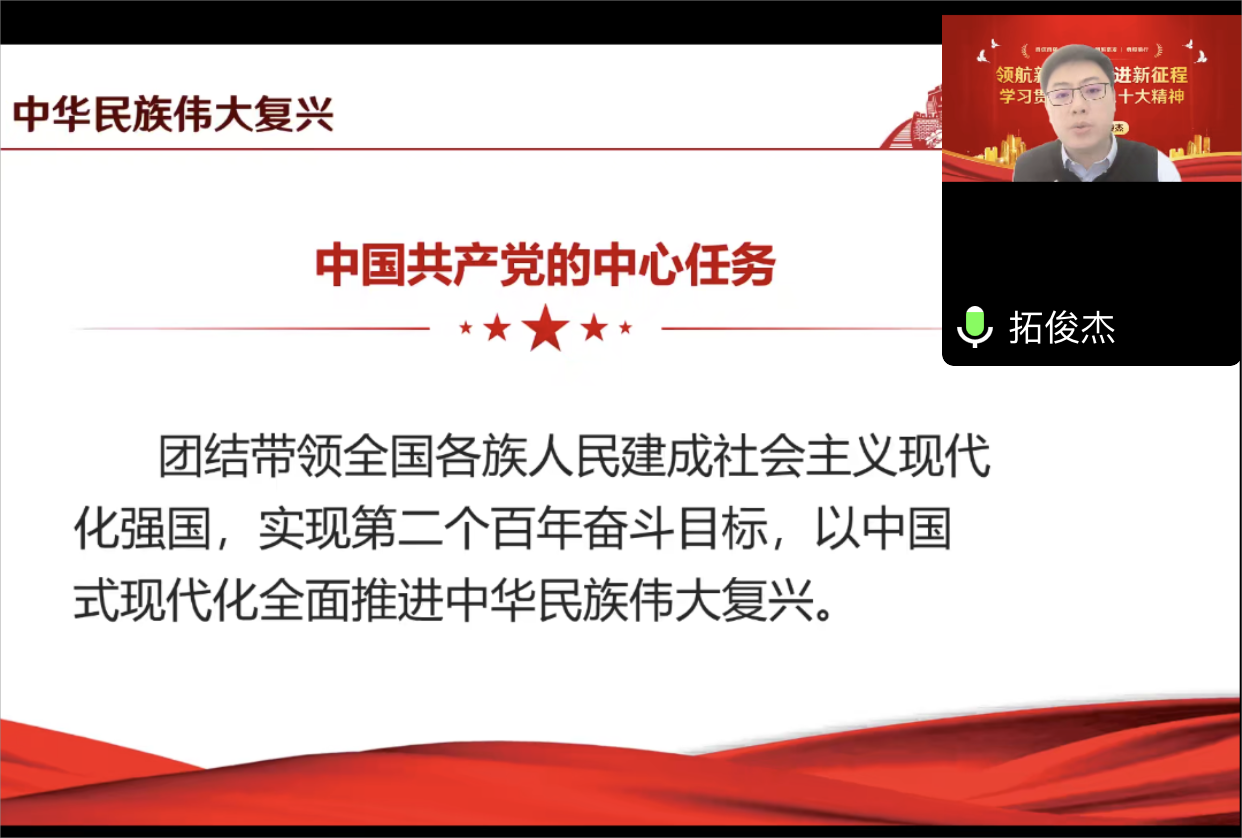 拓俊杰书记围绕深刻把握党的二十大的重要意义、深刻把握过去五年和新时代十年的伟大变革、深刻把握习近平新时代中国特色社会主义思想、深刻把握中国式现代化的中国特色和本质要求、深刻把握全面建设社会主义现代化国家的目标任务以及深刻把握以伟大自我革命引领伟大社会革命的重要要求等方面深入解读了党的二十大精神。拓俊杰书记的宣讲报告内容全面系统、重点突出,引导学员进一步深入领会党的二十大精神实质。金年会jinnianhuicom教将继续深入学习贯彻党的二十大精神,确保党的二十大精神在学院落地生根,推动学院实际工作。
