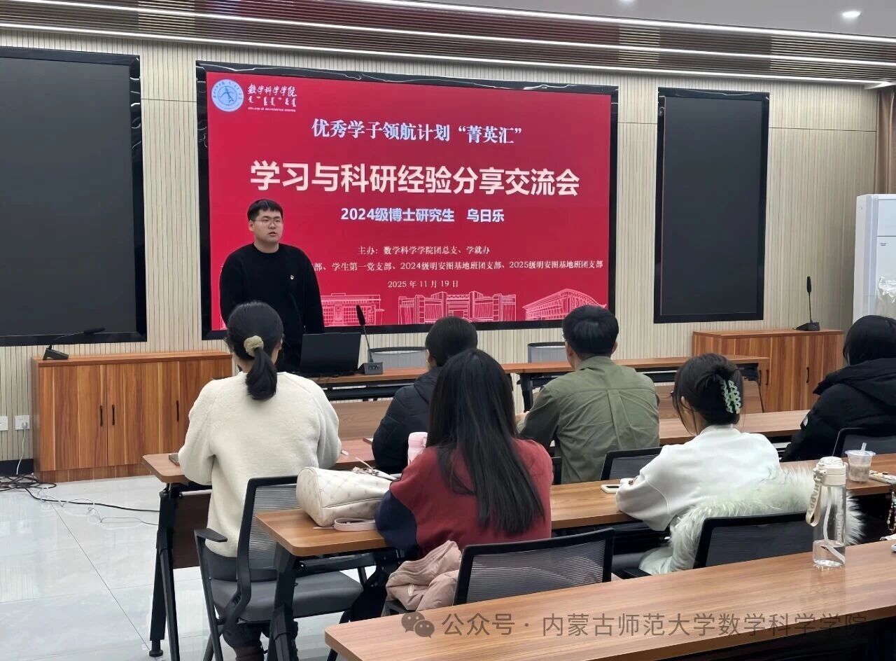 为发挥先进典型的示范引领作用,推动党建带团建有效落实,博士生党支部联合学生第一党支部、明安图基地班团支部启动“优秀学子领航计划”,由“全区高校研究生党员标兵”、2024级博士研究生、博士研究生党支部组织委员乌日乐分享了科研与学习经验,并与在座的同学们进行了交流。