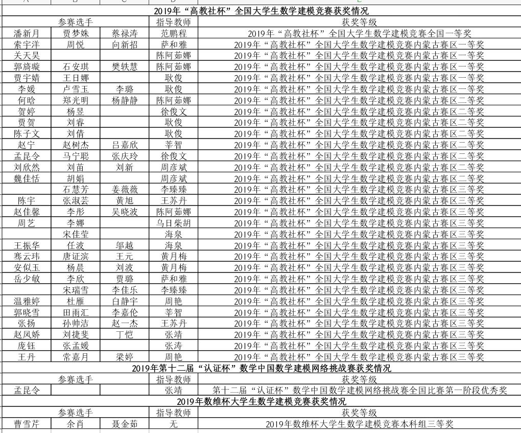 2019年金年会官网学生积极参与各类数学建模竞赛,并屡获佳绩,其中在2019“高教社杯”全国大学生数学建模竞赛中,由金年会官网2017级潘新月、贾梦姝、蔡禄涛三位同学组成,范鹏程老师指导的队获得2019年全国大学生数学建模竞赛全国一等奖。这是我校首次获得该项比赛全国一等奖,也是全区高校在本次比赛中获得的唯一一等奖,另有5个队获得内蒙古自治区赛区一等奖,8个队获得赛区二等奖,16个队获得赛区三等奖;在2019第十二届“认证杯”数学中国数学建模网络挑战赛中1队获得全国比赛第一阶段优秀奖;在2019数维杯大学生数学建模竞赛中1队获得本科组三等奖。