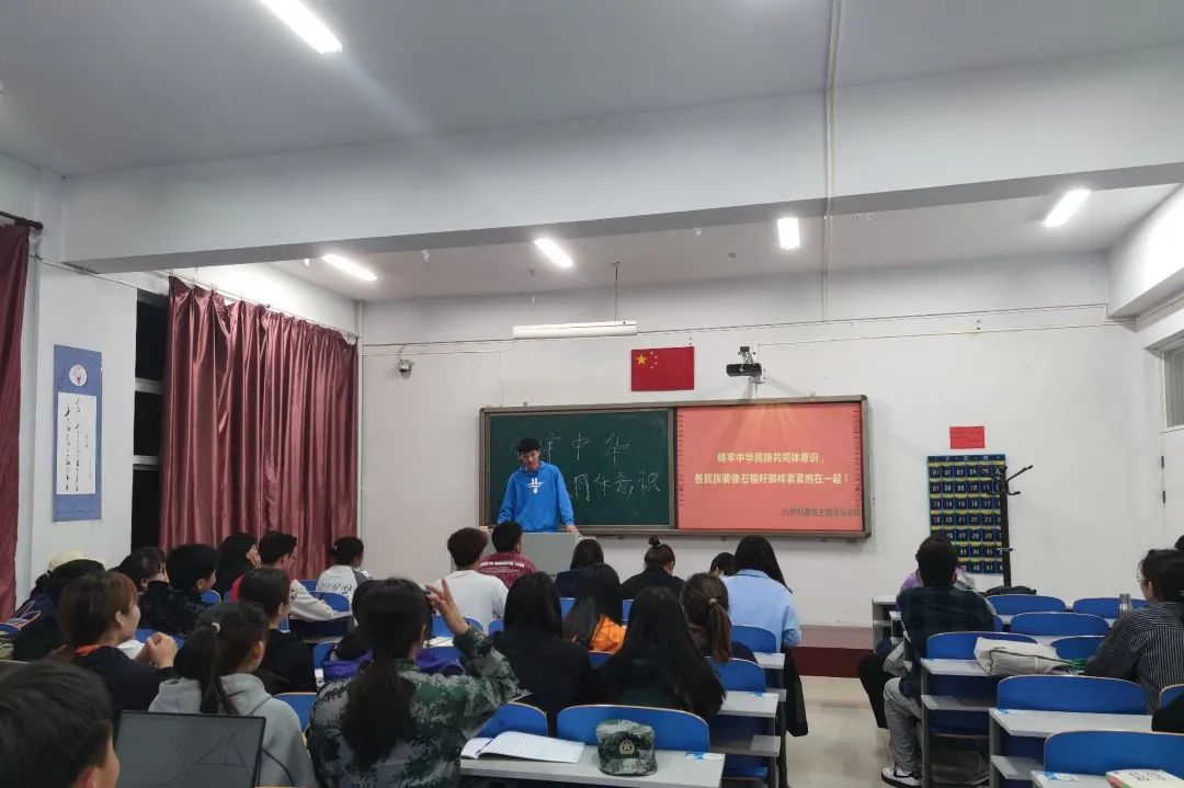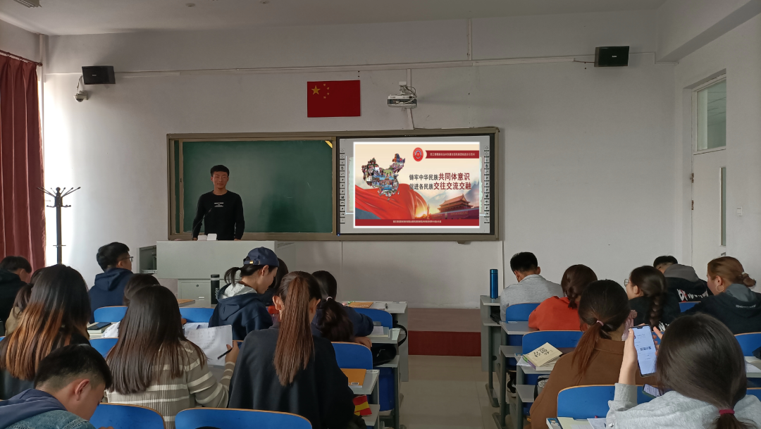 团日活动中,团支书对共同体意识做了简短的介绍后,同学们上台分享自己了解到的知识。大家在互相学习、互相分享的气氛下学习铸牢中华民族共同体意识的重大意义。