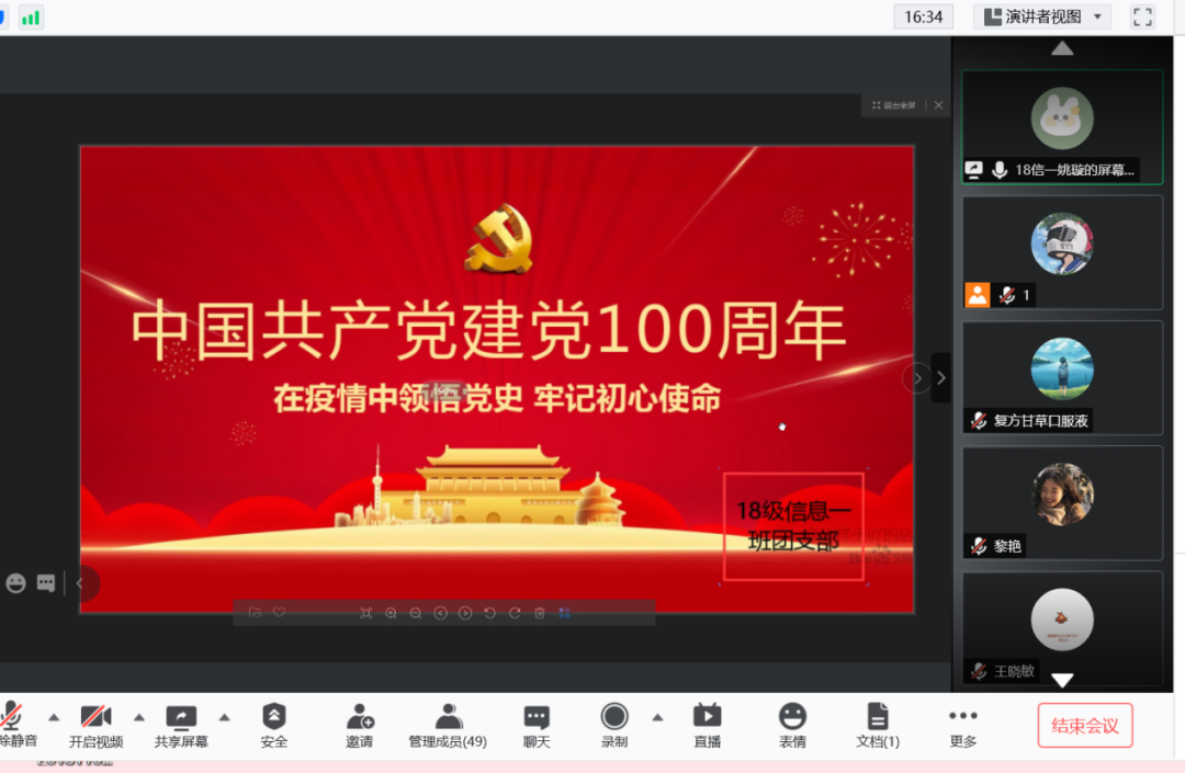 18级信息一班的同学召开线上腾讯会议,全班一起观看了学习视频资料,感受了党的这一百年。