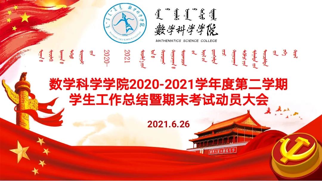 2021年6月26日下午,金年会官网2020-2021学年度第二学期学生工作总结暨期末考试动员大会于学院楼报告厅举行。本次大会由学院团总支书记皮建东老师主持,出席大会的领导和老师有:学院党委书记扎其劳教授,学院党委副书记、副院长季建光老师,学院副院长包霞副教授,学院学生思想政治工作辅导员、20级汉二班班主任刘勇波老师,20级蒙班班主任娜仁格日乐老师,20级汉一班班主任刘常彪老师。
