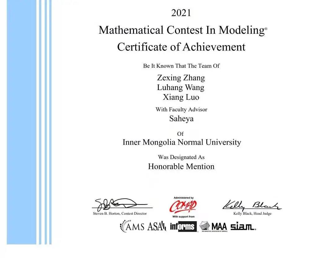 在2021美国大学生数学建模竞赛中,金年会官网王路航、罗翔、张泽兴取得二等奖!