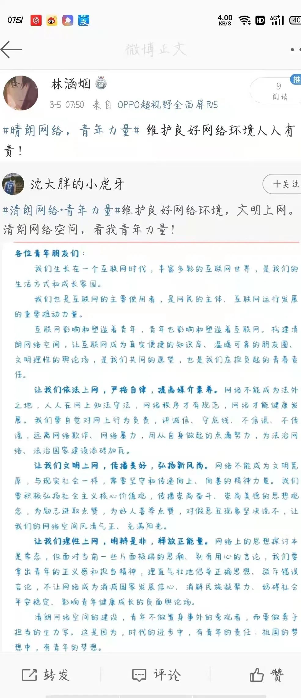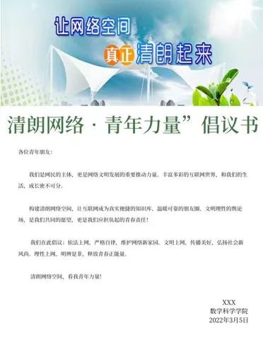 为进一步贯彻落实习近平总书记和党中央的重要要求,动员广大团员青年积极参与构建清朗网络空间,金年会诚信信誉至上金年会jinnianhuicom组织各班进行了“清朗网络,青年力量”主题活动,号召大家积极按照习近平总书记提出的“勤学、修德、明辨、笃实”要求,将共青团员的先进性和担当精神延伸到网上,在网上积极发出青年好声音、形成强劲青春正能量。