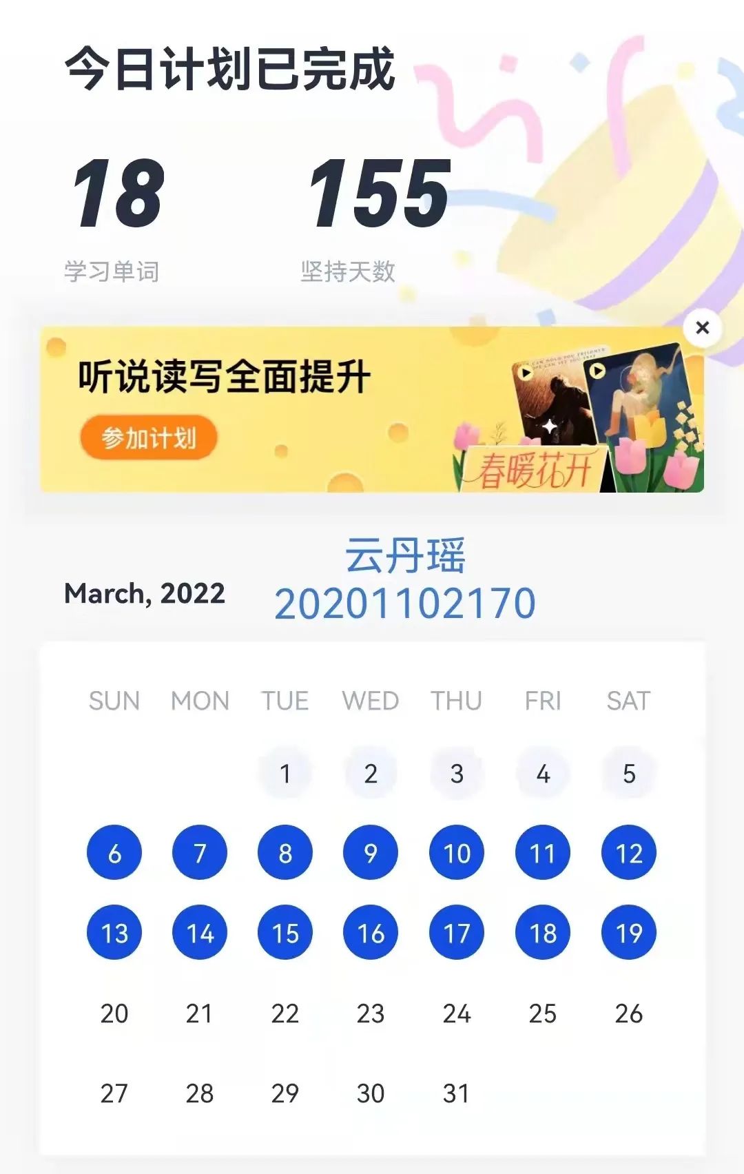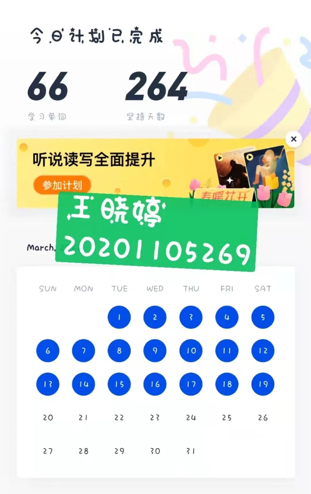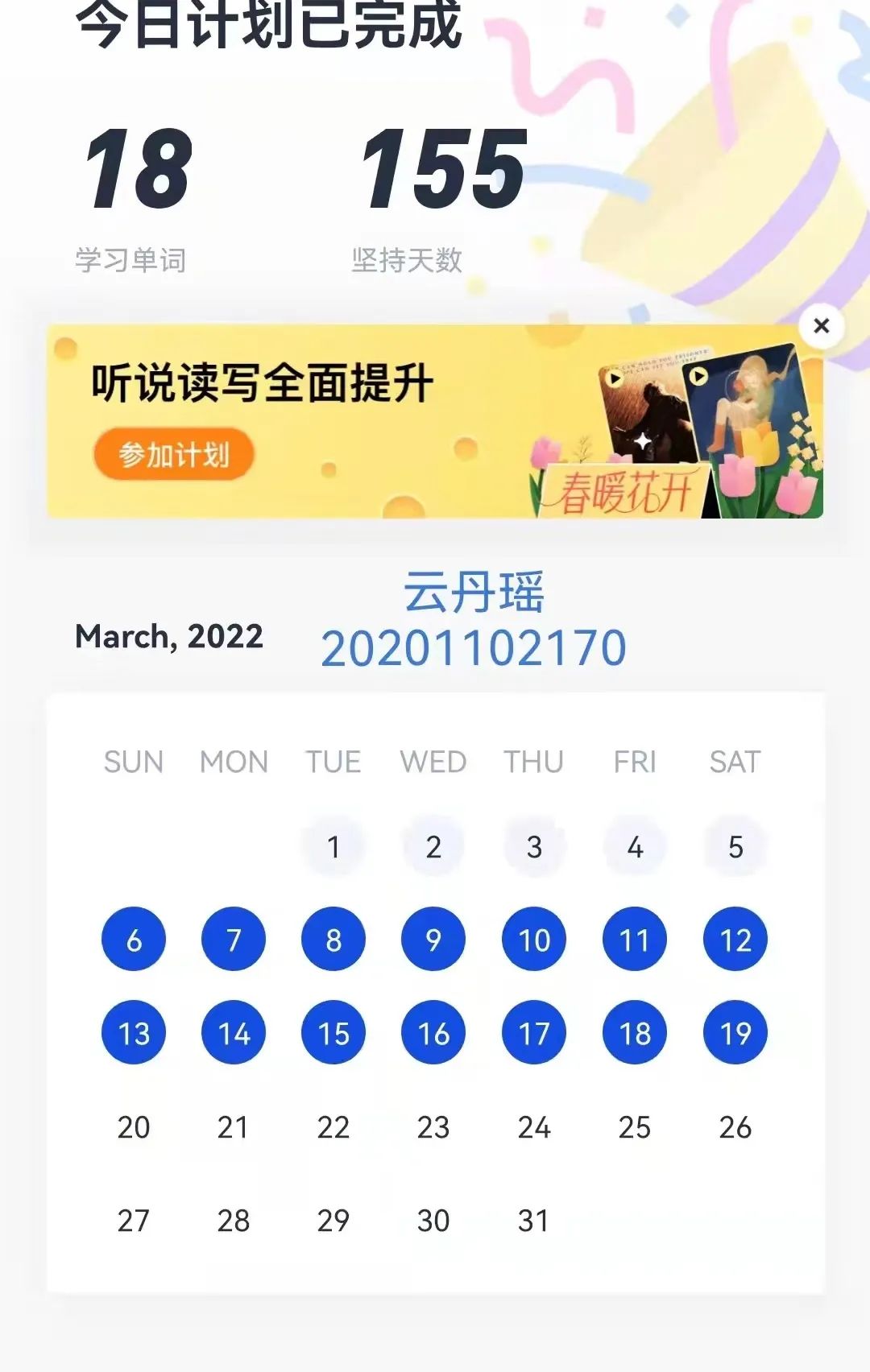 为了丰富学生的居家学习生活,提高学生的学习自觉性,金年会jinnianhuicom开展了“学习解疫,提升有我”的英语单词打卡活动,150名学生积极响应活动,进行打卡学习。