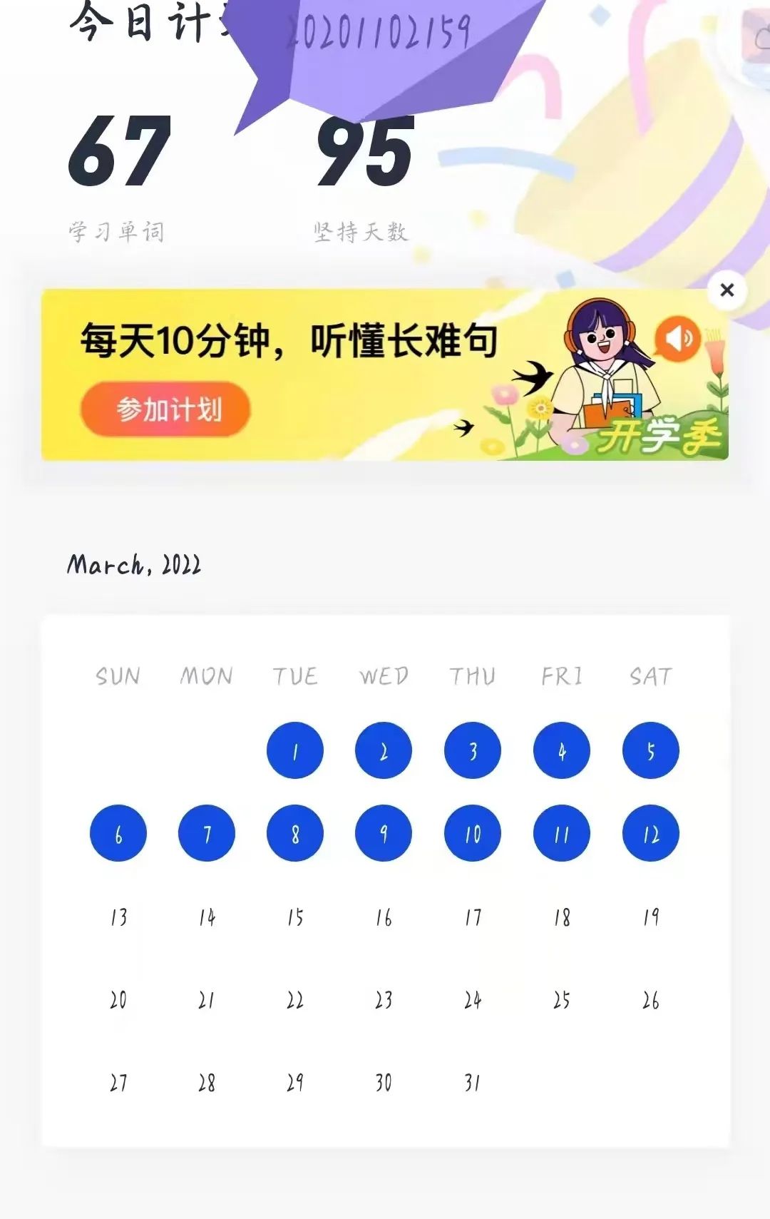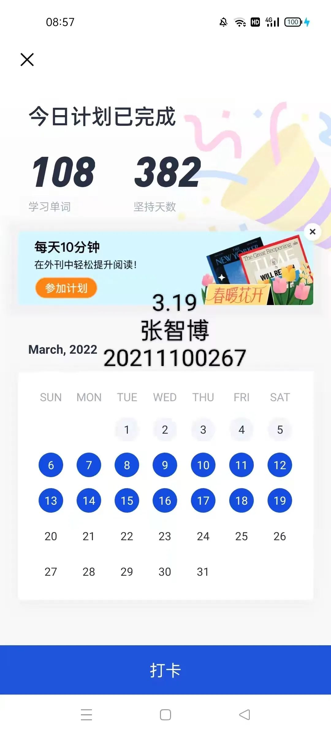 这次的单词打卡活动让同学们提高了学习的自觉性,我们更加愿意积极主动地去学习英语。打卡时候的成就感让我开心不已,我也愿意坚持下去,想看看我能走到多远。一天天的积累学习,也让我们离理想的自己更进一步。不积跬步,无以至千里。让我们一起努力吧!