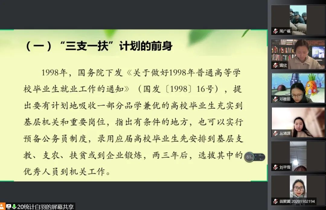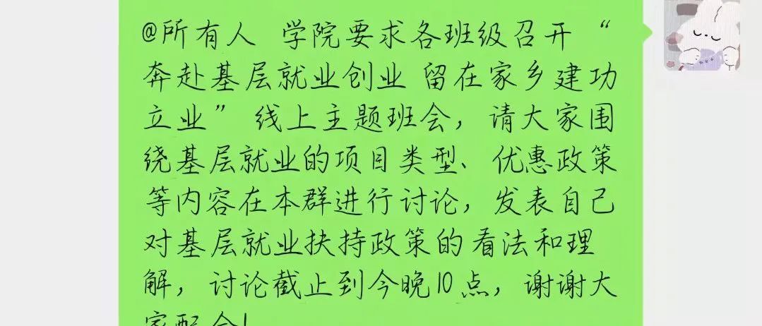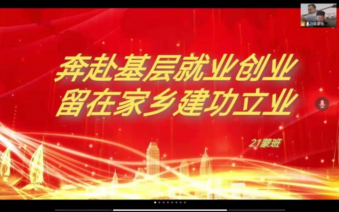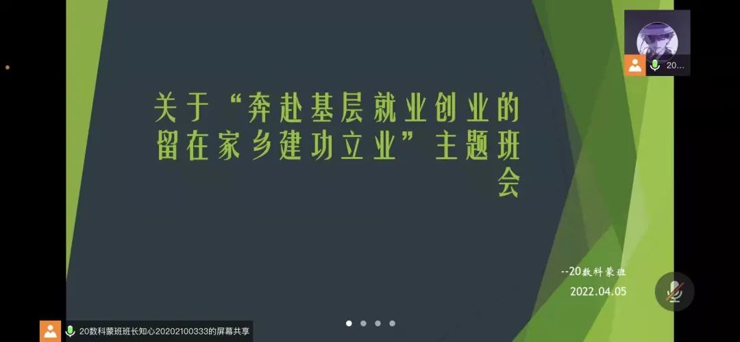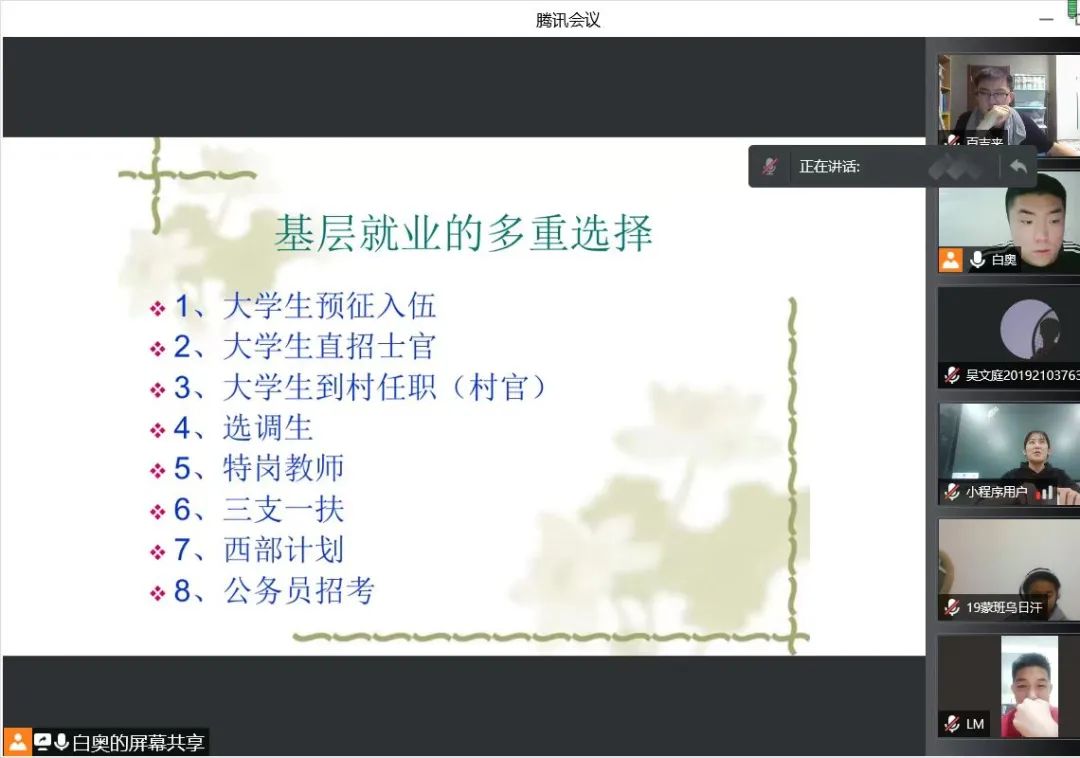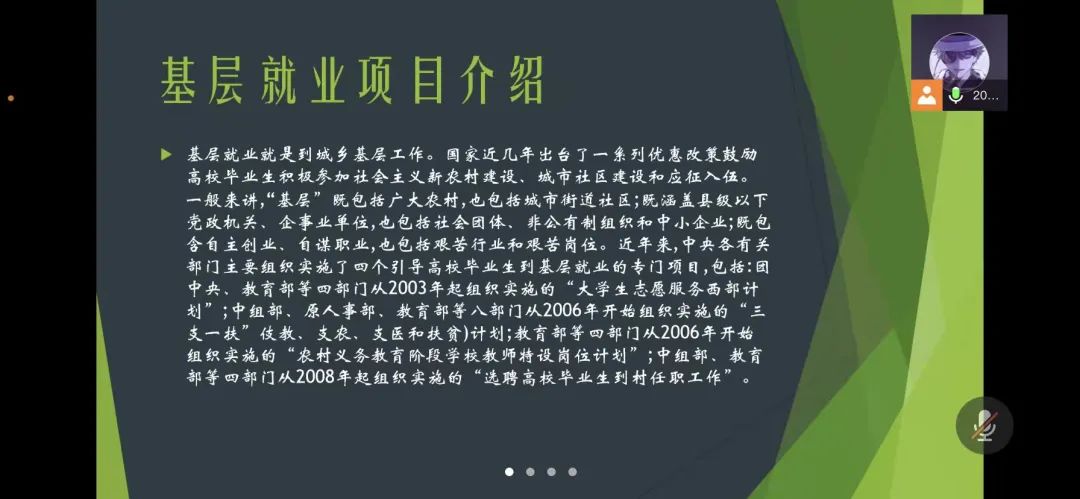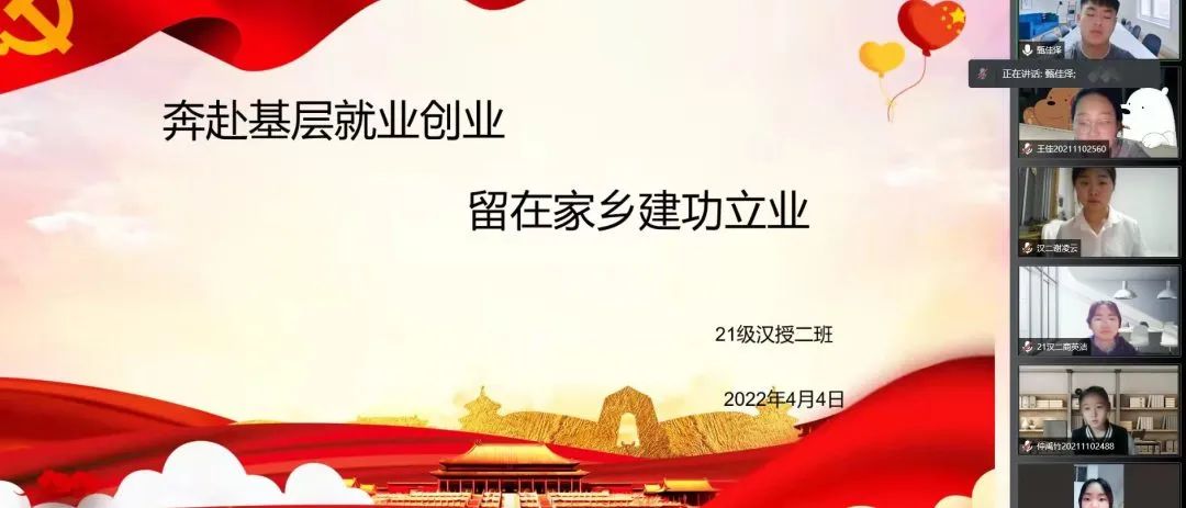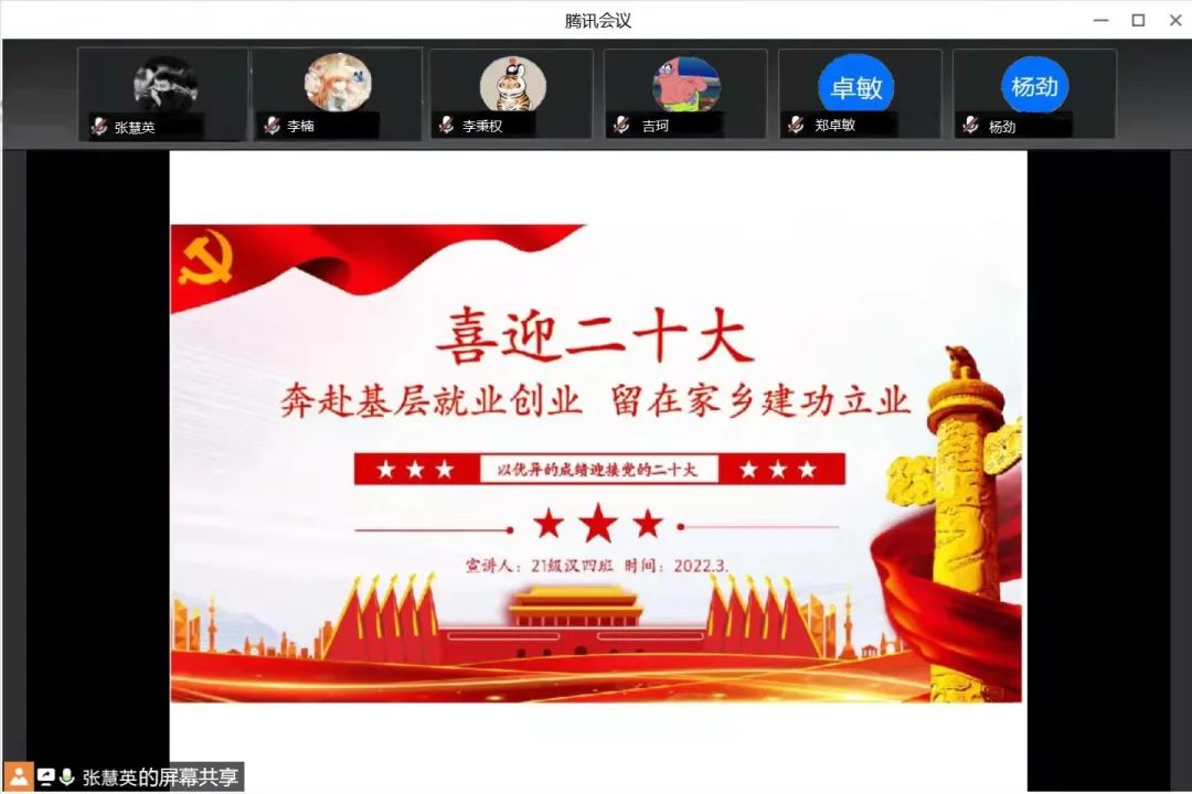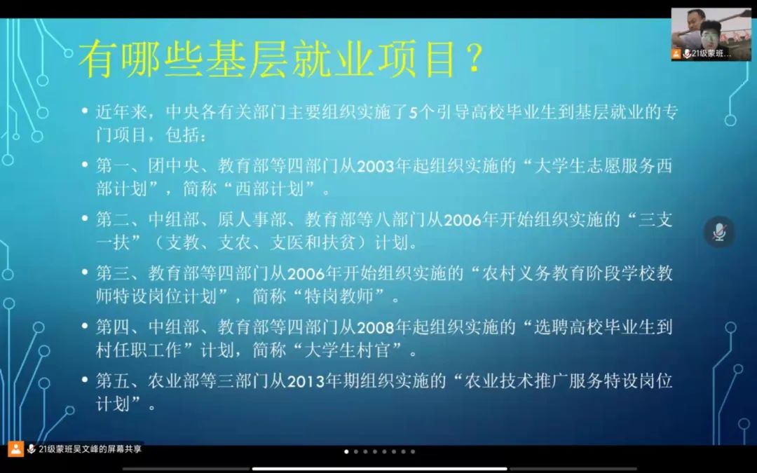 国家近几年出台了一系列优惠政策鼓励高校毕业生积极参加社会主义新农村建设、城市社区建设。为进一步让同学们了解基层就业,金年会jinnianhuicom各班级开展“奔赴基层就业创业,留在家乡建功立业”线上主题班会,针对基层就业的项目类型,优惠政策等内容进行学习,在充分理解基层就业扶持政策的基础上引导各班同学们加入基层就业。