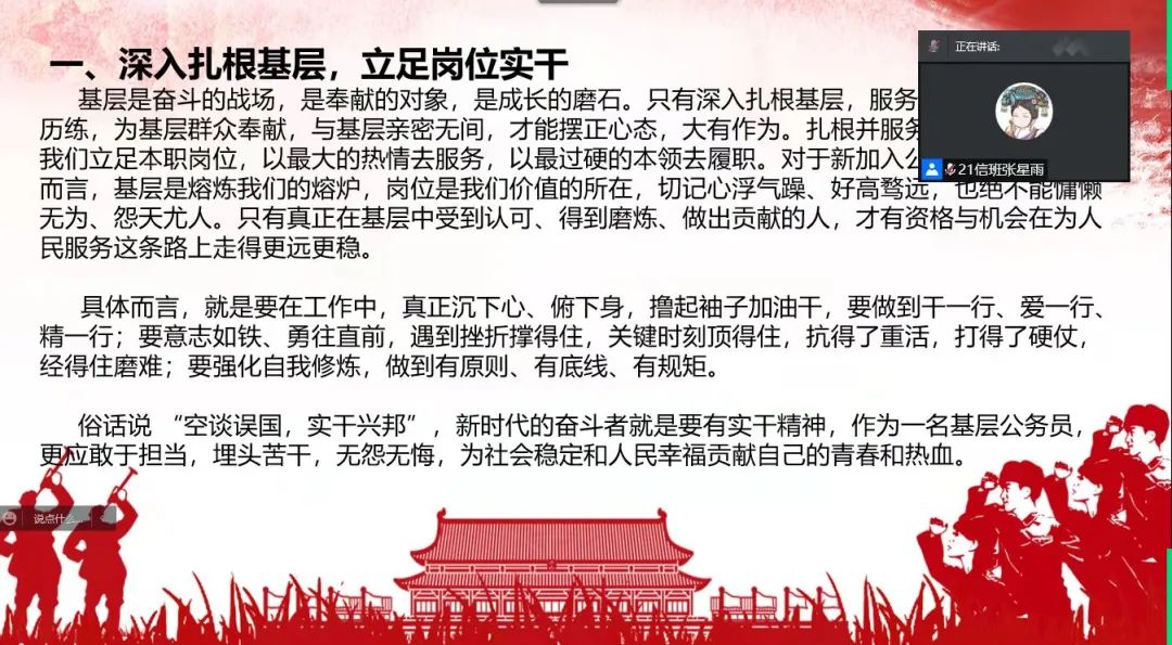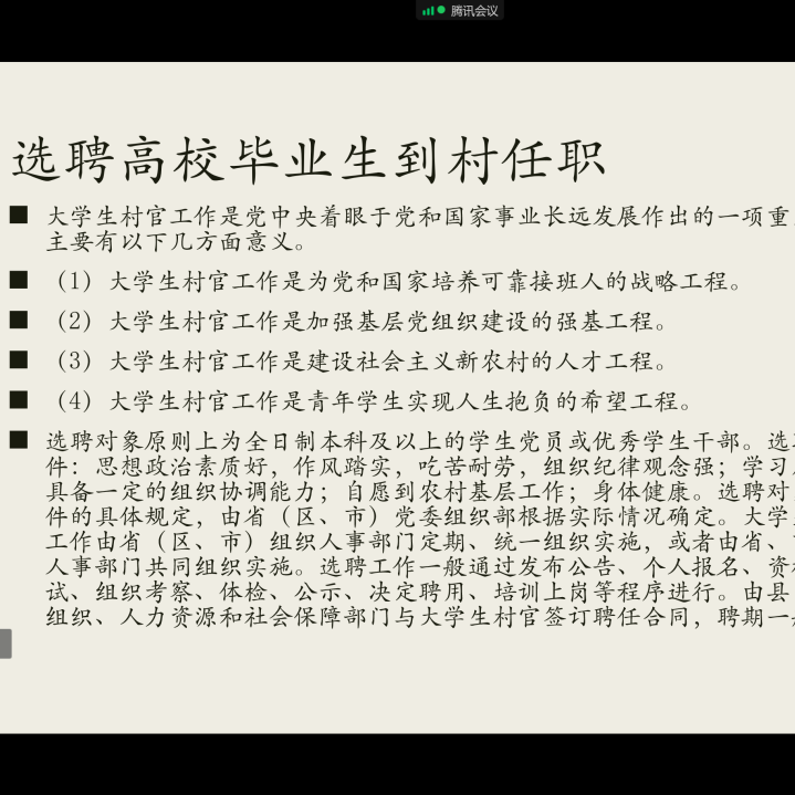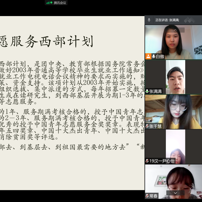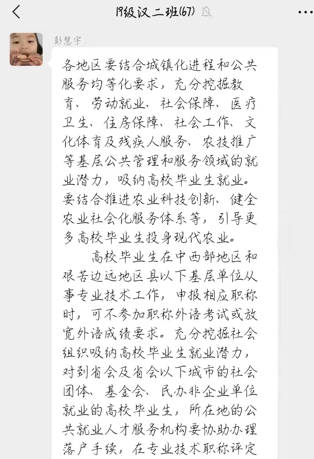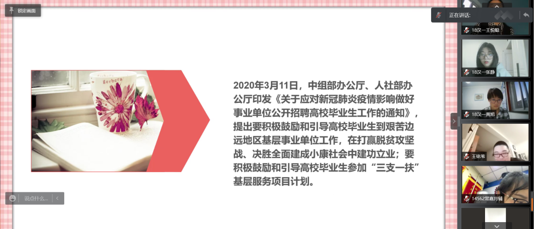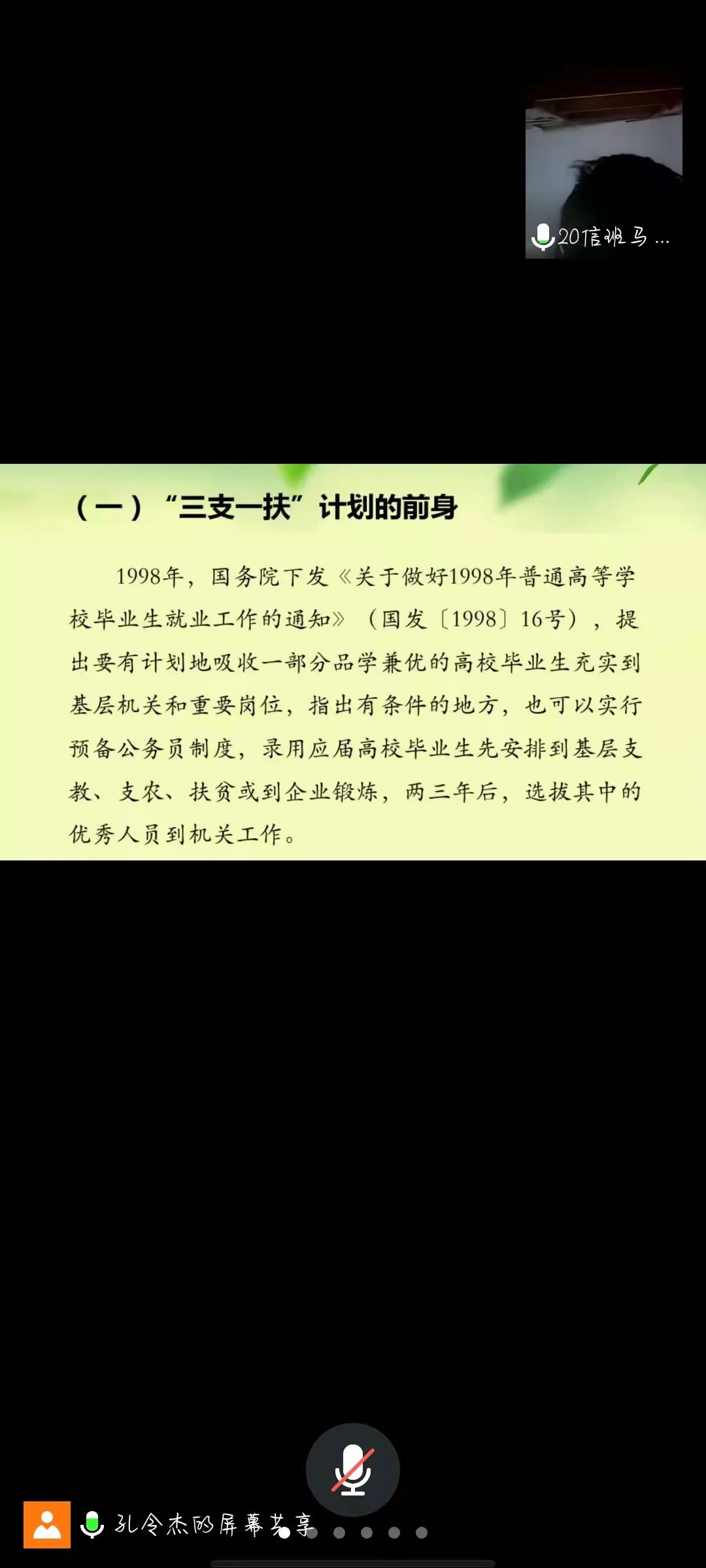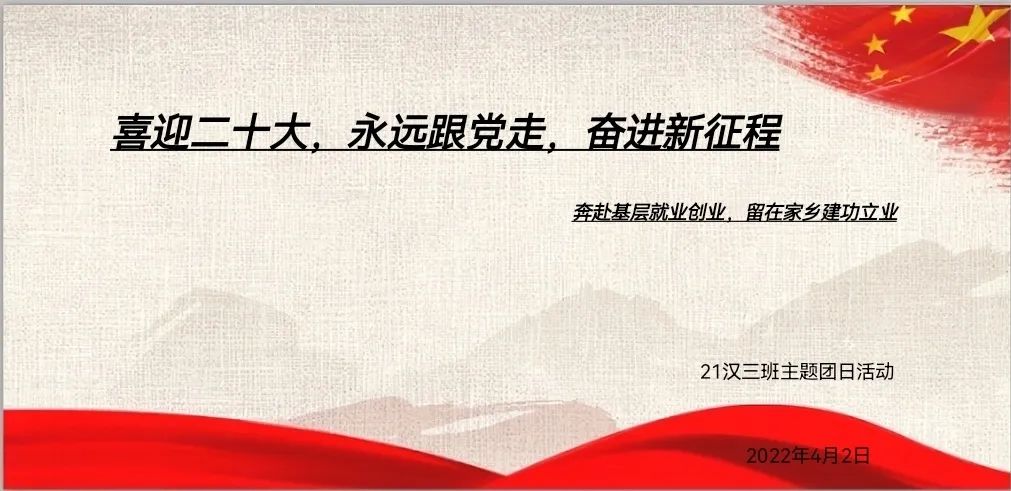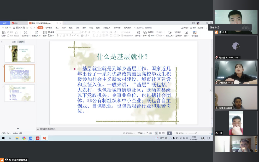 国家近几年出台了一系列优惠政策鼓励高校毕业生积极参加社会主义新农村建设、城市社区建设。为进一步让同学们了解基层就业,金年会jinnianhuicom各班级开展“奔赴基层就业创业,留在家乡建功立业”线上主题班会,针对基层就业的项目类型,优惠政策等内容进行学习,在充分理解基层就业扶持政策的基础上引导各班同学们加入基层就业。