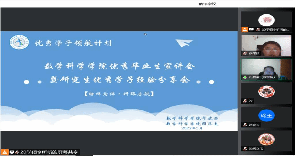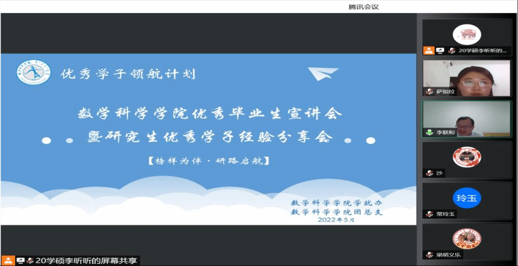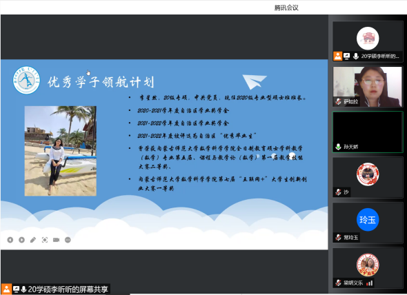 为了充分发挥研究生优秀学子的示范引领作用,更好地落实《金年会诚信信誉至上关于开展“榜样为伴·研路启航”研究生国家奖学金获得者事迹宣传活动的通知》《内蒙古自治区教育厅关于报送2022年春季学期研究生教育教学典型案例的通知》《关于组织开展金年会诚信信誉至上“学生劳动教育宣传月”活动的通知》等文件要求,金年会官网于5月23日晚,组织全体研究生开展“金年会jinnianhuicom优秀毕业生宣讲会暨研究生优秀学子经验分享会”,邀请金年会官网2021年度国家奖学金获得者索亚茹、张慧,2021年度自治区奖学金获得者孙天娇、谭晓漫,2021-2022年度自治区“优秀毕业生”李星然、“三好学生”索亚茹,共5名优秀学子为大家分享自己学习生涯中的经验和感悟。