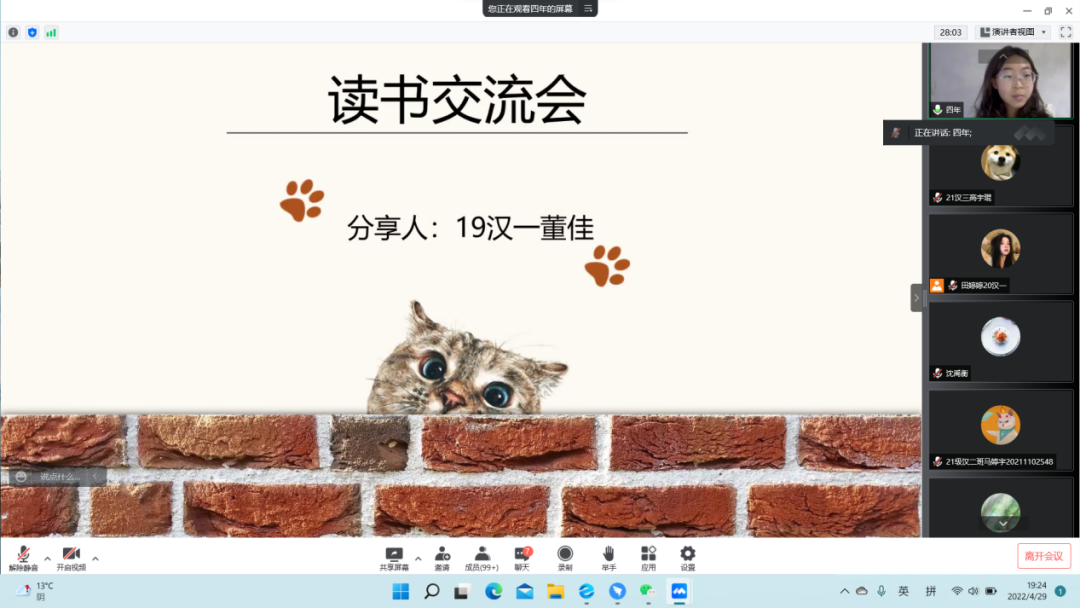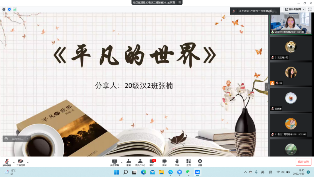 第三位进行分享的同学是19级汉一班的张语桐同学。曾获2020年校级一等奖学金,2021年校级一等奖学金,2021年乌兰夫奖学金。分享的书籍为《人生海海》。