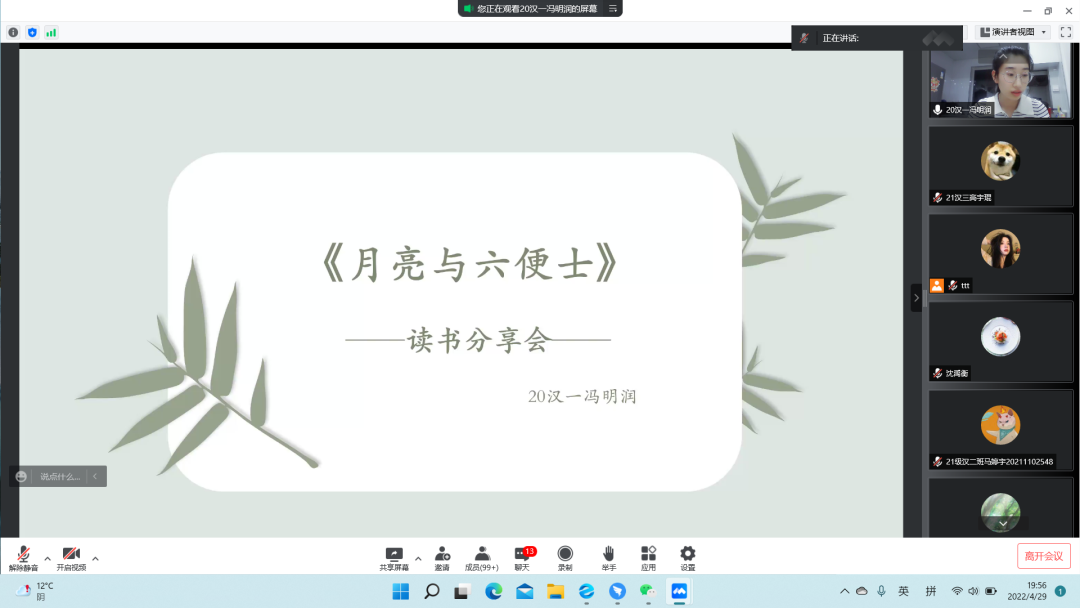 最后一名进行分享的同学是20级汉一班的冯明润同学。曾获2020-2021学年度自治区励志奖学金。分享的书籍为《月亮与六便士》。