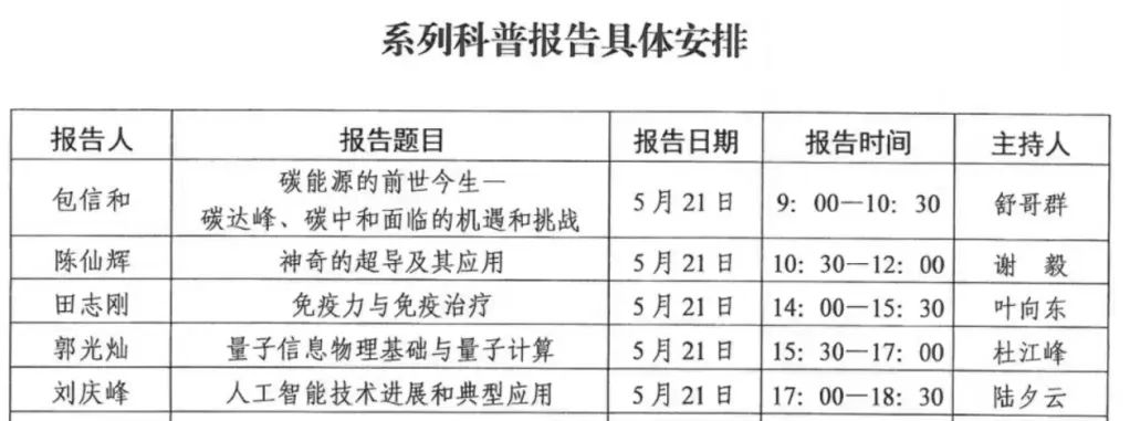 本次系列科普报告,是由中国科学院院士包信和、陈仙辉、郭光灿、中国工程院院士田志刚、科大讯飞董事长刘庆峰做线上直播。