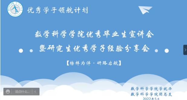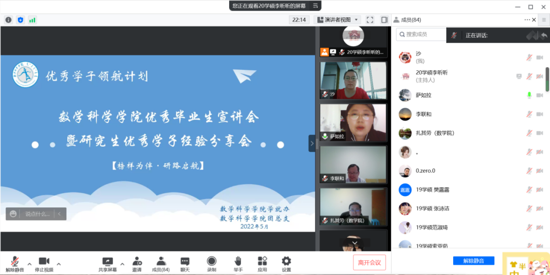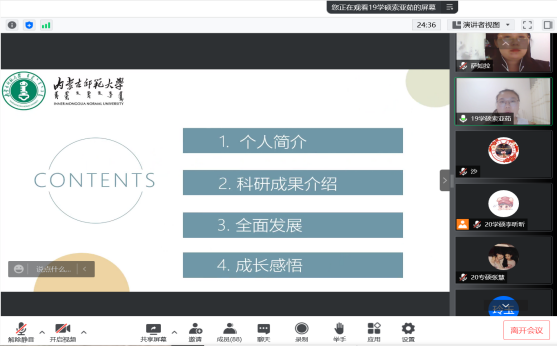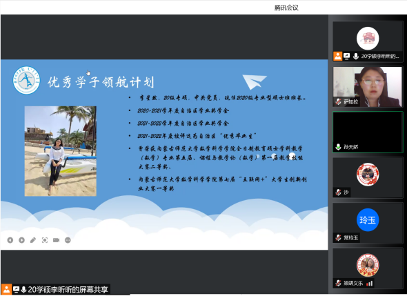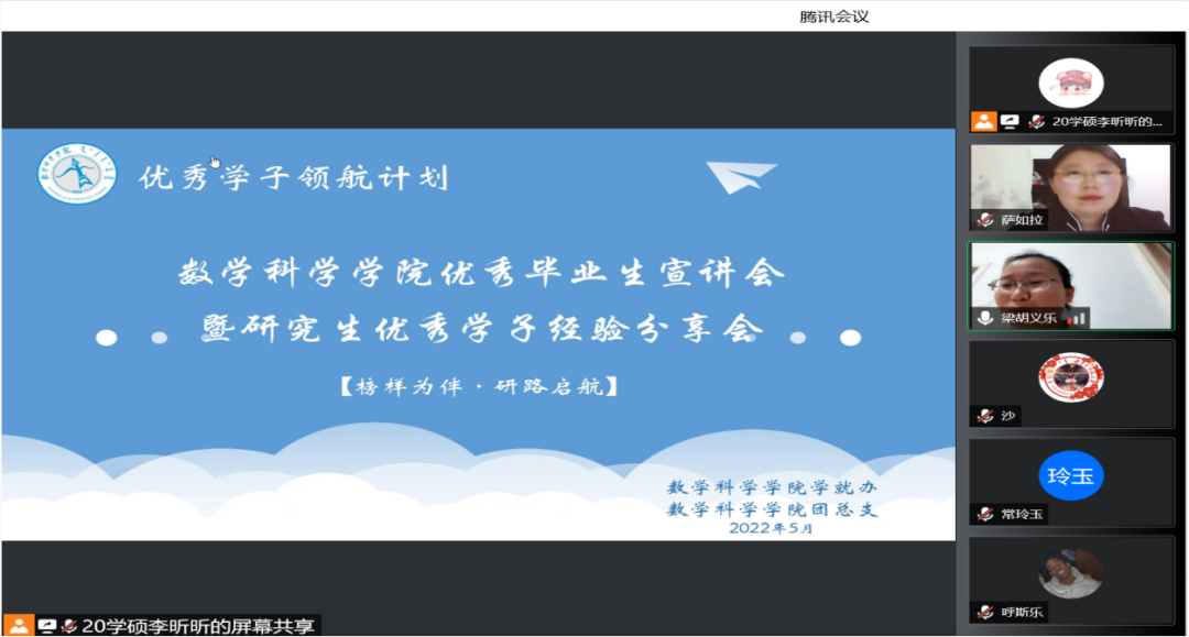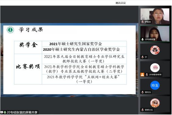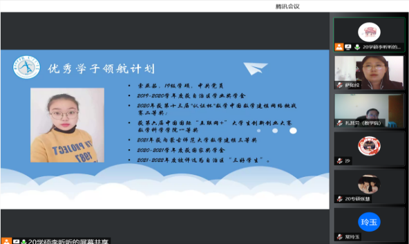 为了充分发挥研究生优秀学子的示范引领作用,更好地落实《金年会诚信信誉至上关于开展“榜样为伴·研路启航”研究生国家奖学金获得者事迹宣传活动的通知》《内蒙古自治区教育厅关于报送2022年春季学期研究生教育教学典型案例的通知》《关于组织开展金年会诚信信誉至上“学生劳动教育宣传月”活动的通知》等文件要求,金年会官网于5月23日晚,组织全体研究生开展“金年会jinnianhuicom优秀毕业生宣讲会暨研究生优秀学子经验分享会”,邀请金年会官网2021年度国家奖学金获得者索亚茹、张慧,2021年度自治区奖学金获得者孙天娇、谭晓漫,2021-2022年度自治区“优秀毕业生”李星然、“三好学生”索亚茹,共5名优秀学子为大家分享自己学习生涯中的经验和感悟。