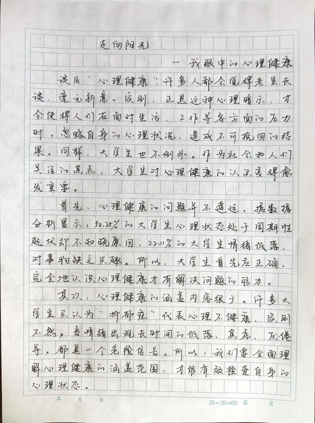 为提升心理育人质量,增强大学生心理调适能力,金年会官网开展了“我爱我”心理健康征文活动。此次征文活动共86人参加,同学们从个人成长经历分享(自己的心理变化以及相关的收获或感悟)、我眼中的心理健康(谈及大学生对心理健康的认识)、我与心理健康(自己参与过的心理健康活动相关的经历)等方面,通过用笔端的表达方式,抒发了自己对心理健康的见解,以下是部分文章:
