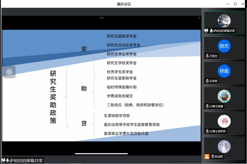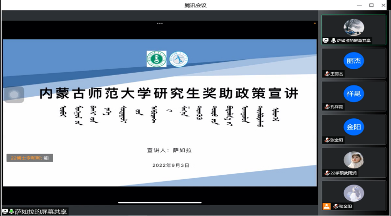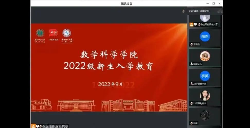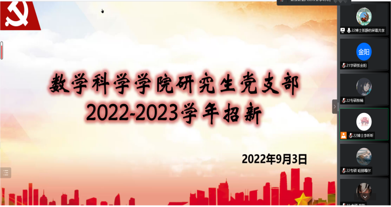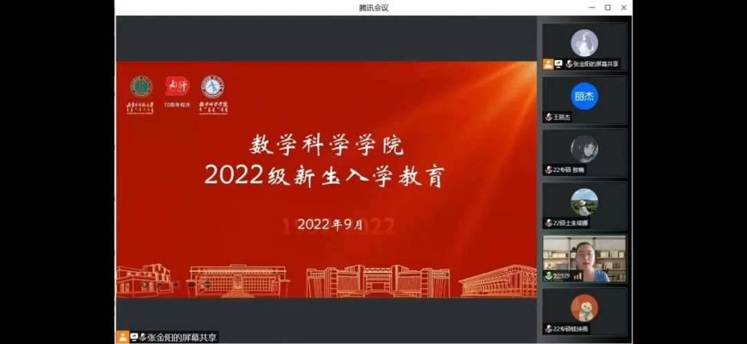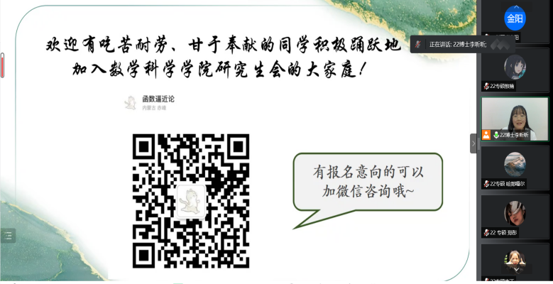 2022年9月3日晚20:30,金年会官网举办了线上新老生见面交流会,两校区全体研究生参加此次活动,活动由20级学硕李昕昕同学主持。张静同学、李颖同学、李昕昕同学分别对学院研究生党支部、研究生团支部、研究生会分别做了介绍及招新安排,同时希望同学们积极参加学生组织,在学习生活之余提升自己各方面能力。