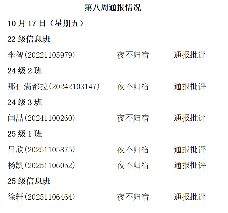 金年会jinnianhuicom2025——2026年度第一学期第八周通报情况