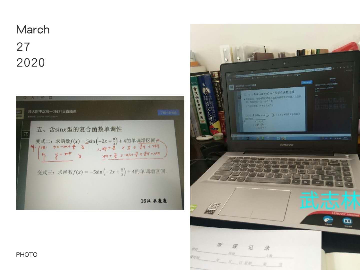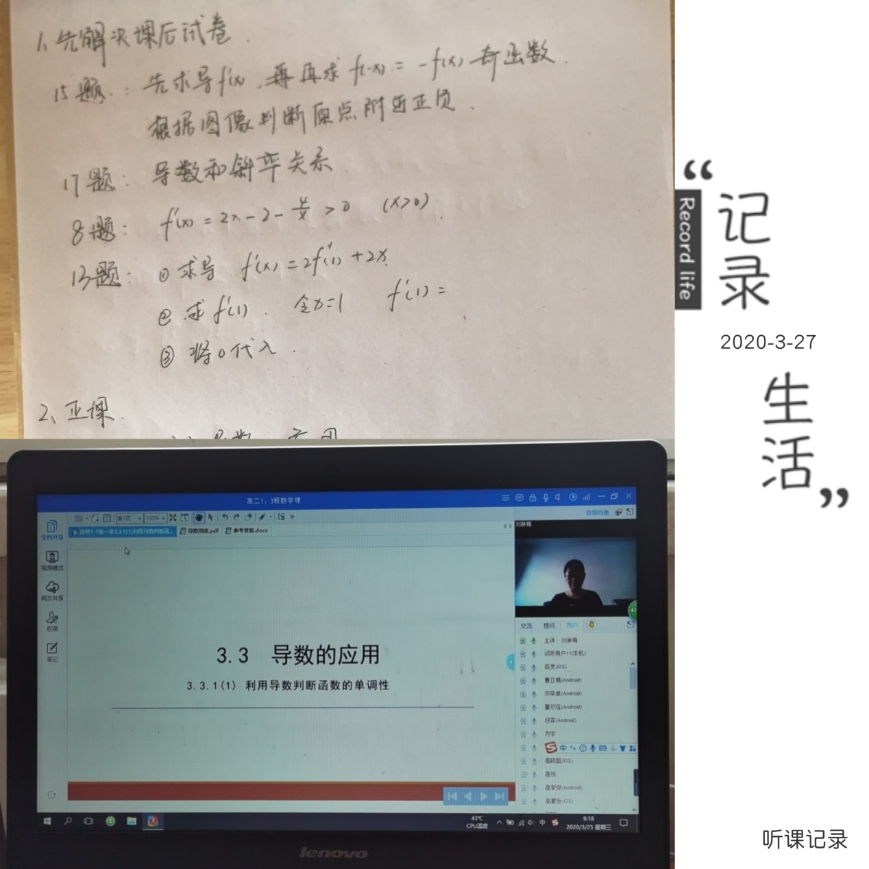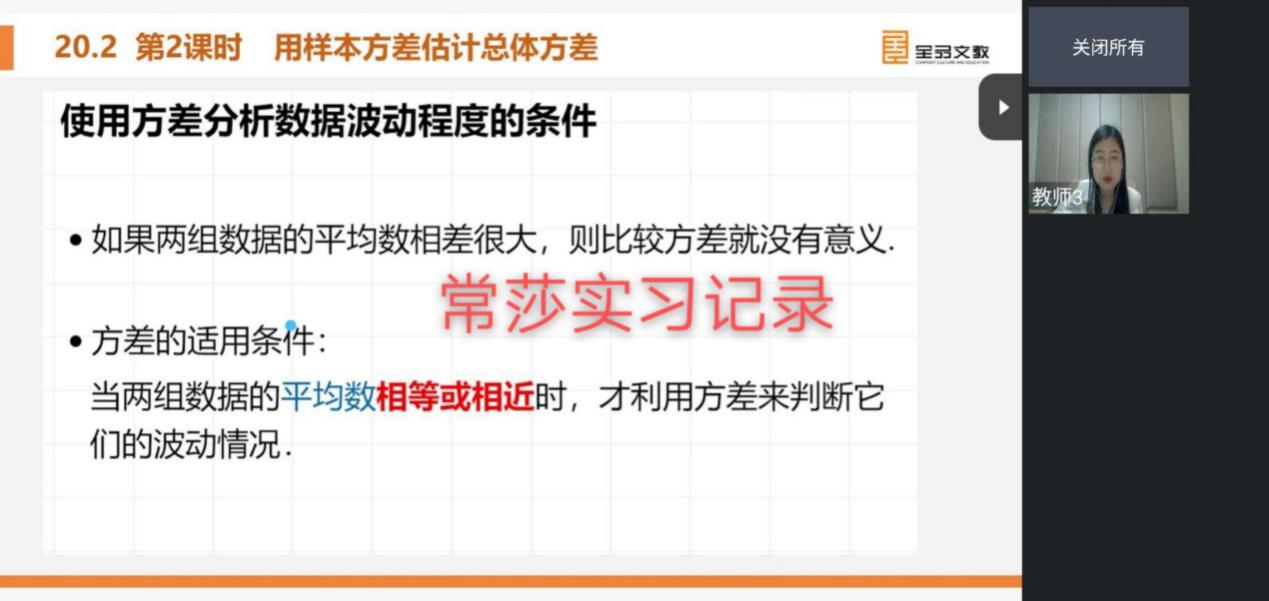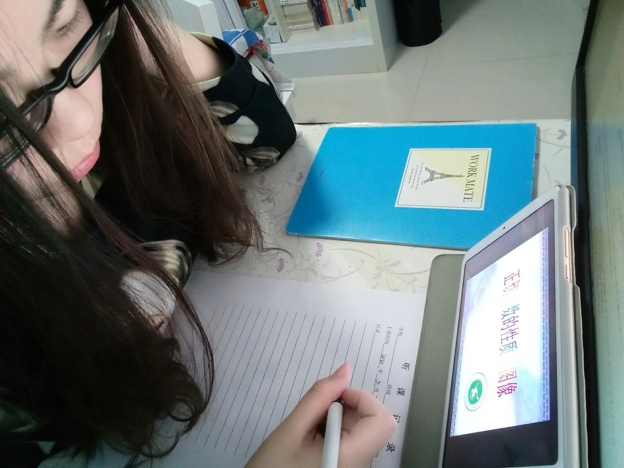 实习的生活已经开始一周了,早上打开直播课并认真地完成听课记录是每天最重要的一项日程。在这一周里,我有了很多体会:虽说之前在学校里已经上过很多知识技能方面的课程,也有过几次上讲台的机会,但是我发觉我欠缺的东西还是很多。尽管由于疫情原因老师们只能用直播的方式来讲课,但是他们简洁大方却“干货”满满的课件,内容充实且条理清晰的讲课流程,时不时引入的数学史知识都让我受益匪浅。在接下来的线上学习中,我相信我一定会有更多的收获。