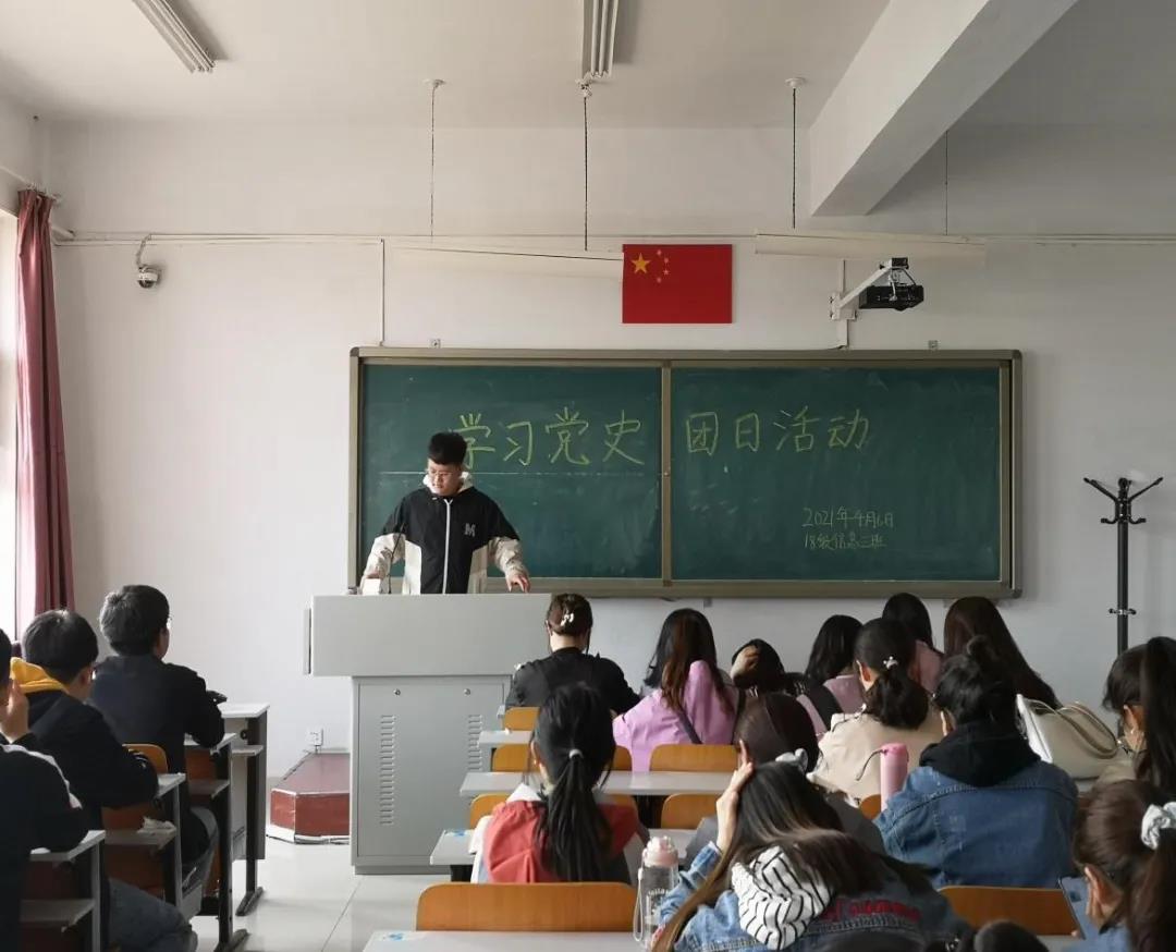 18级信息三班于科技楼405教室组织开展了“学习党史”团日活动。活动中由组织委员讲读中国共产党建党历程。同学们积极参与认真聆听。