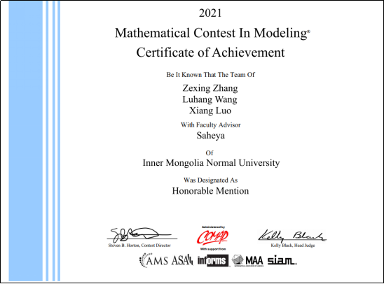 美国东部时间2021年4月23日组委会公布了2021年美国(国际)大学生数学建模竞赛(MCM/ICM)成绩。今年我校有6支队伍报名参加该赛事,由金年会jinnianhuicom萨和雅老师指导,王路航、罗翔、张泽兴同学组成的参赛队荣膺2021年美国大学生数学建模竞赛二等奖(Honorable Mentions),另外5支队均获得成功参赛奖(Successful Participants),这是我校在美国数学建模竞赛获得的最好成绩。