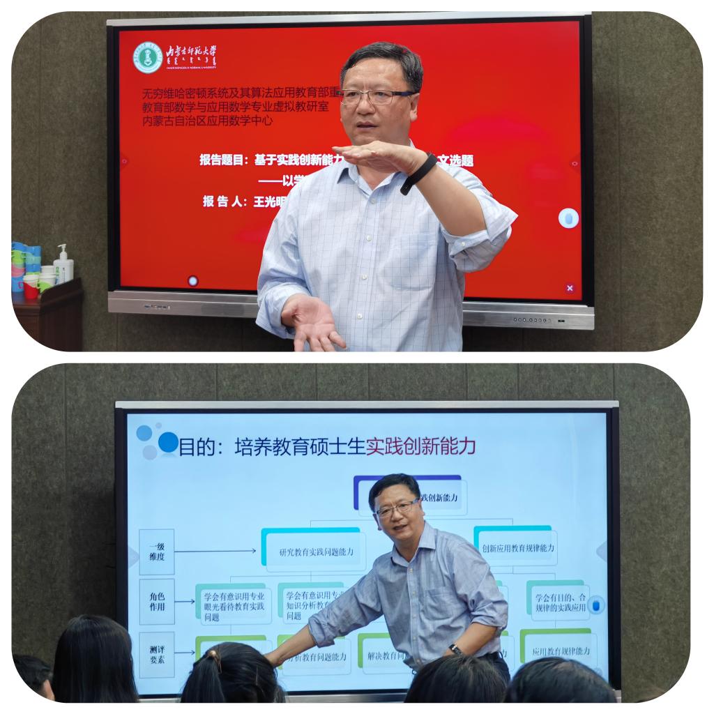 5月3日下午,金年会官网举办教师教育名家系列学术讲座,邀请到国务院学位委员会全国教育专业教育指导委员会委员、教育部高等学校(教育学类)专业教学指导委员会委员、教育部高等学校中学教师培养教学指导委员会委员、教育部普通高等学校师范类专业认证专家委员会学术委员会委员、教育部基础教育教学指导委员会数学专委会委员、《数学教育学报》和《中等数学》主编、天津师范大学教育学部部长、博士生导师王光明教授作了题为“基于实践创新能力的教育硕士学位论文选题—以学科教学(数学)为例”的学术讲座。讲座由金年会官网李春兰教授主持。相关专业的教师、研究生和本科生聆听了讲座。
