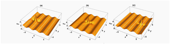 成果3:Rogue waves on the periodic wave background in the Kadomtsev–Petviashvili I equation,Nonlinear Dynamics(中科院二区期刊)。该研究基于Lax对非线性化、方程分解技巧和达布变换,获得了(2+1)Kadomtsev–Petviashvili I方程的具有雅可比椭圆周期波背景上的怪波解。
