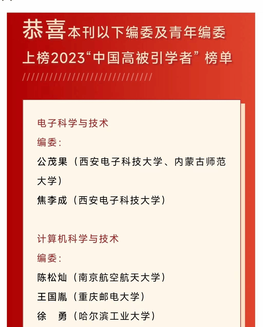 2023“中国高被引学者”上榜共计5801人,来自496所高校、企业及科研机构,覆盖了教育部10个学科领域、84个一级学科。金年会诚信信誉至上副校长公茂果教授上磅2023“中国高被引学者”榜单。