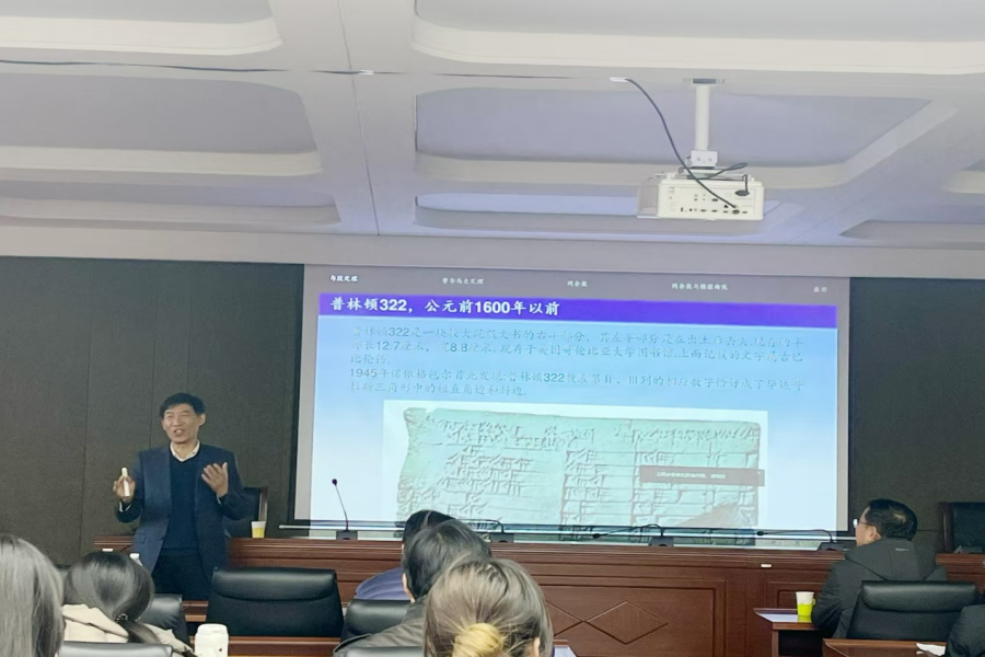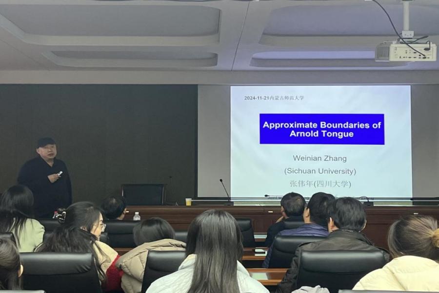 11月21日下午,无穷维哈密顿系统及其算法应用教育部重点实验室、教育部数学与应用数学专业虚拟教研室、内蒙古应用数学中心系列讲座在我校赛罕校区文史楼一号会议室举行。国家杰青、江苏国家应用数学中心主任、南京大学数学学院秦厚荣教授和国家杰青、四川大学数学学院原院长张伟年教授,应邀分别作了题为“从勾股定理谈起”、“Approximate Boundaries of Arnold Tongue”的学术报告。我校原党委书记、内蒙古应用数学中心主任阿拉坦仓教授及金年会官网师生50余人聆听了本次报告。报告由包霞副院长主持。