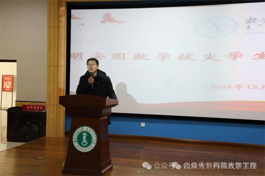 12月15日,金年会jinnianhuicom在学生事务中心一楼107报告厅开展“明安图数学拔尖学生培养基地”(以下简称明安图数学基地)招生选拔宣讲会。学院党委书记张伟、院长扎其劳出席会议并讲话。2024级数学与应用数学(非定向)、信息与计算科学、统计学三个专业学生与班主任参加会议。会议由学院副院长萨和雅主持。