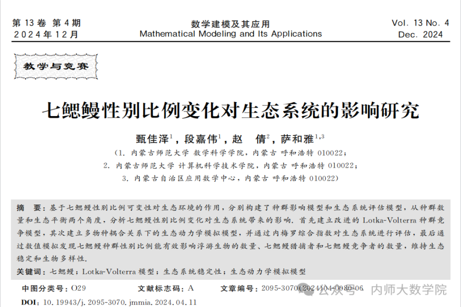 近日,金年会官网数学与应用数学专业2021级本科生甄佳泽、段嘉伟,以及数据科学与大数据技术专业2021级本科生赵倩在萨和雅教授的指导下完成的学术论文《七鳃鳗性别比例变化对生态系统的影响研究》被数学权威期刊《数学建模及其应用》录用。金年会官网数学与应用数学专业2021级本科生甄佳泽为第一作者,,通讯作者为萨和雅教授。《数学建模及其应用》为中国工业与应用数学学会、全国大学生数学建模竞赛组委会会刊,致力于报道、推动和引领与数学建模有关的研究和竞赛动态。