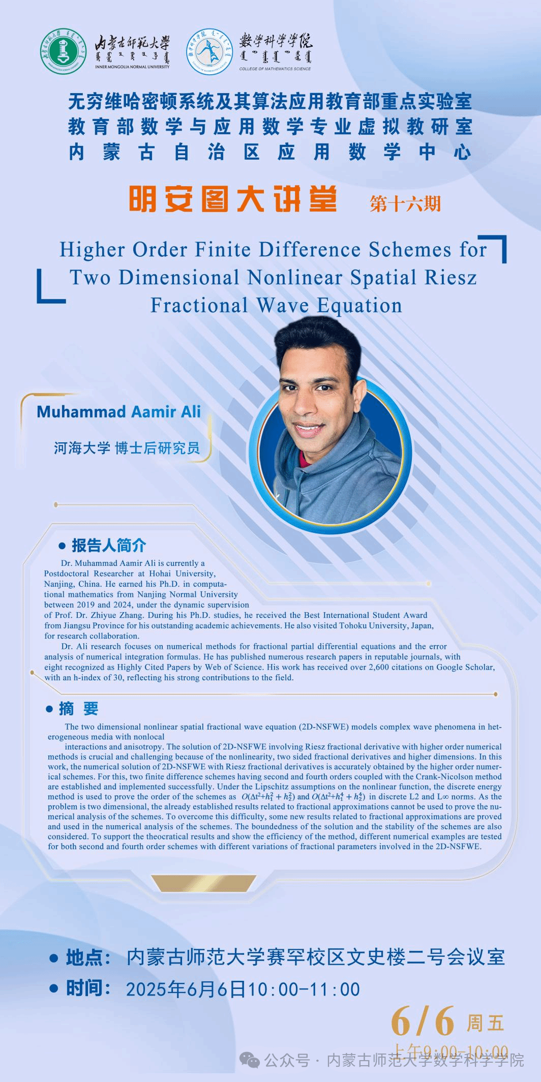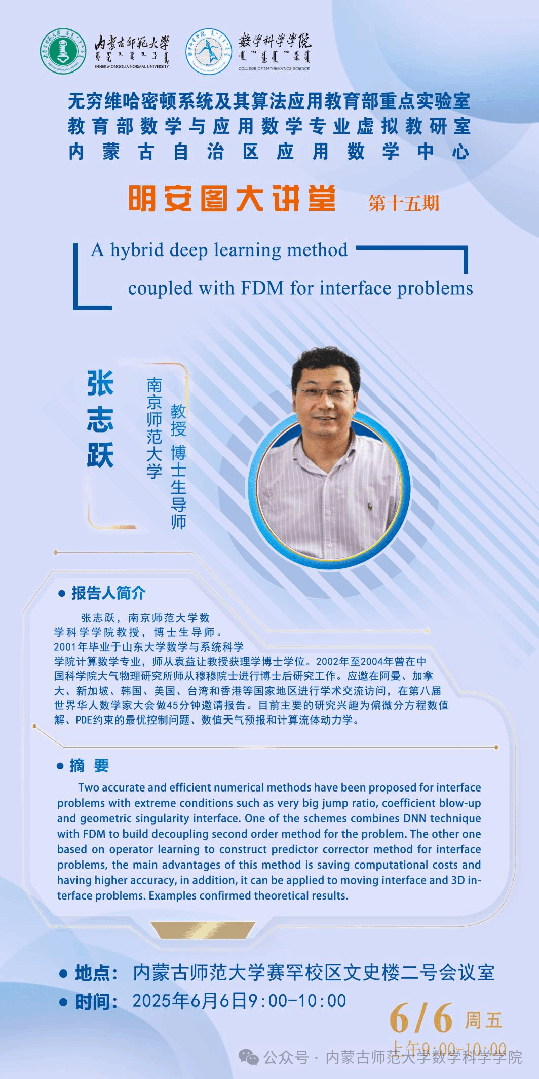 6月6日,金年会jinnianhuicom明安图大讲堂在金年会诚信信誉至上赛罕校区文史楼2号会议室成功举办。本次讲座特邀南京师范大学张志跃教授与河海大学博士后研究员ALI作专题学术报告。两场报告分别聚焦深度学习求解界面问题与分数阶微分方程的高精度数值方法,现场互动热烈。