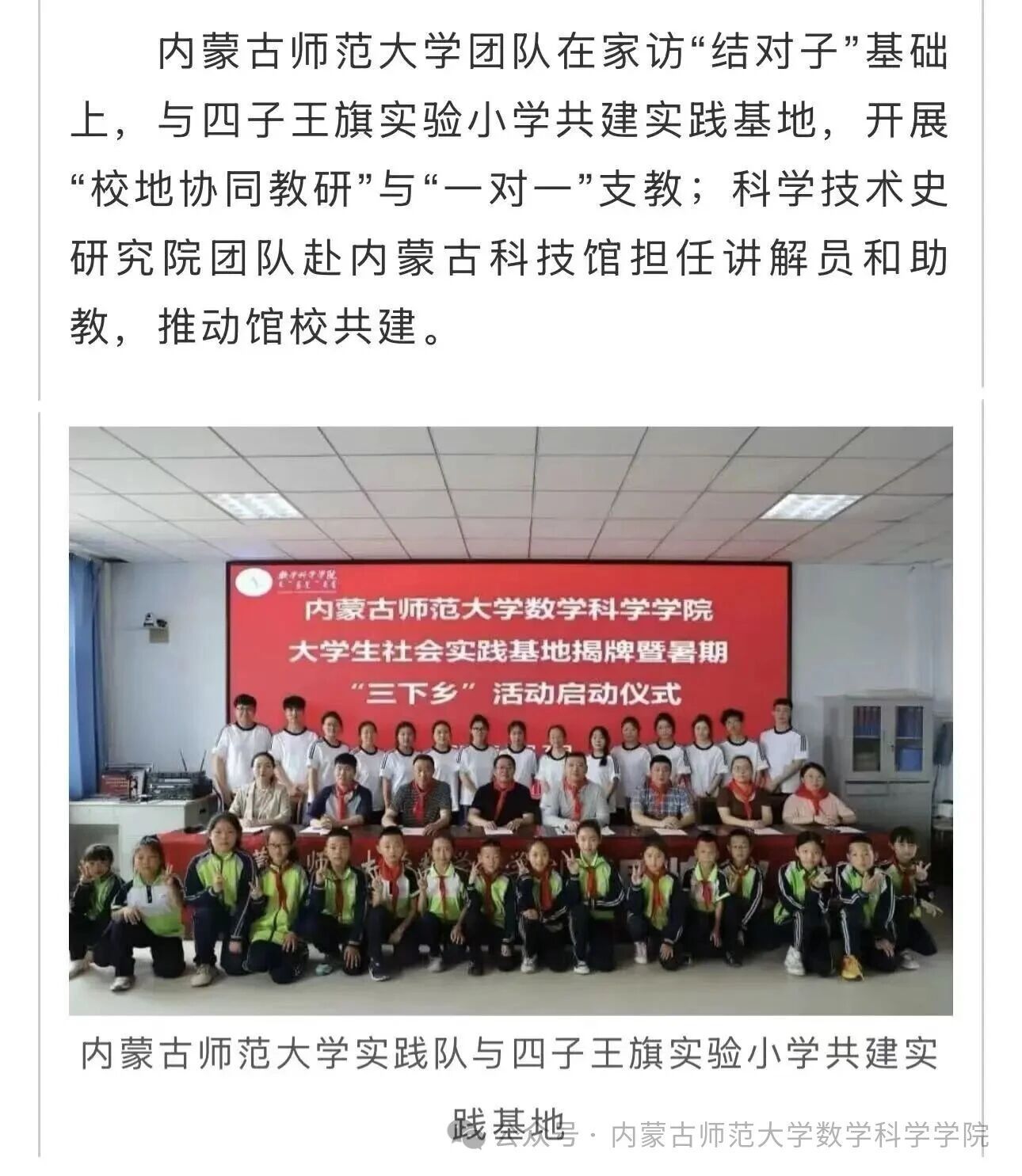 9月17日,内蒙古教育厅发布了“青春聚力两大件事”系列报道,主题为“在守护北疆安全中彰显青年的使命与担当”,金年会官网三下乡实践队与四子王旗实验小学共建实践基地的活动也被纳入其中。