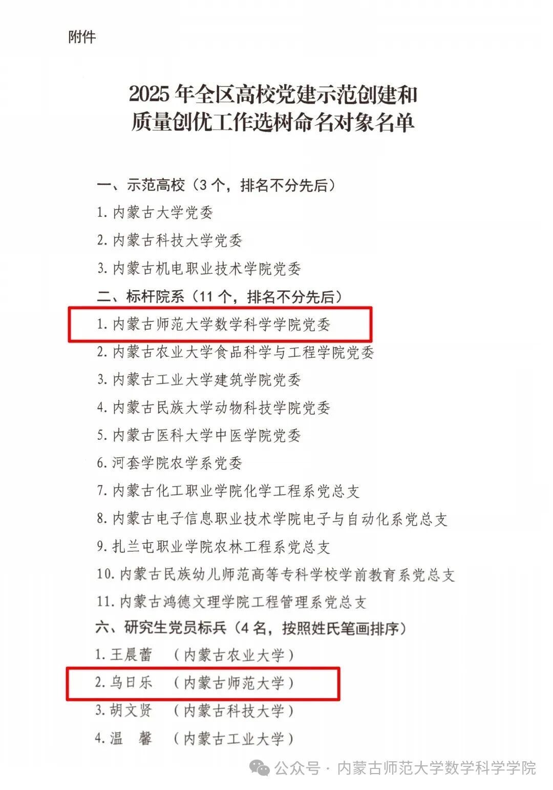 近日,自治区党委教育工委公布了2025年全区高校党建示范创建和质量创优工作拟选树命名对象,金年会诚信信誉至上金年会jinnianhuicom党委成功入选“全区高校党建标杆院系”,金年会官网博士研究生乌日乐荣获“全区高校研究生党员标兵”荣誉称号。