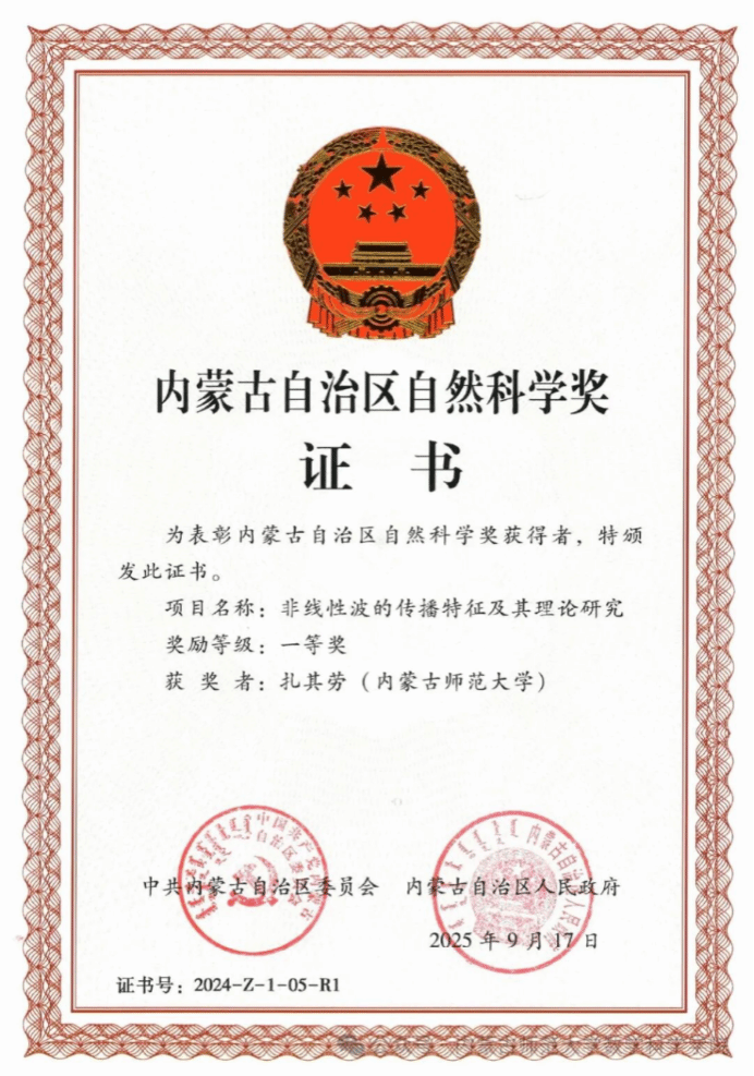 近日,内蒙古自治区科学技术奖励大会在呼和浩特市隆重召开。大会表彰了为全区科技进步和高质量发展作出突出贡献的科技工作者和科研团队。金年会jinnianhuicom院长扎其劳教授团队牵头的《非线性波的传播特征及其理论研究》荣获2024年度自治区自然科学奖一等奖。