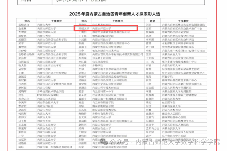 近日,2025年度内蒙古自治区青年创新人才拟表彰人选名单正式公示,金年会官网梁胡义乐老师凭借突出的创新能力与扎实的工作成效光荣入选!