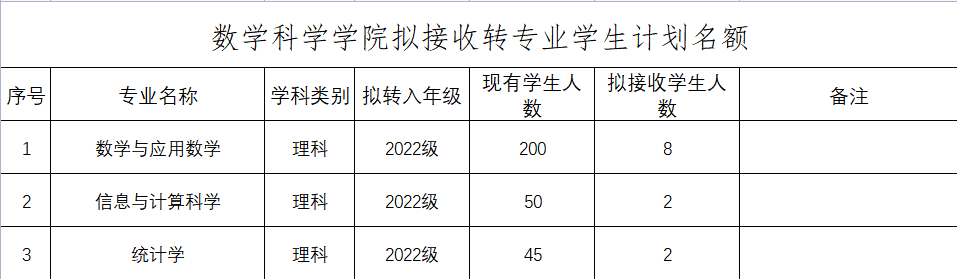 5. 接收转专业学生计划名额12人,其中数学与应用数学8人(按班级人数比例转入)、信息与计算科学2人、统计学2人。
